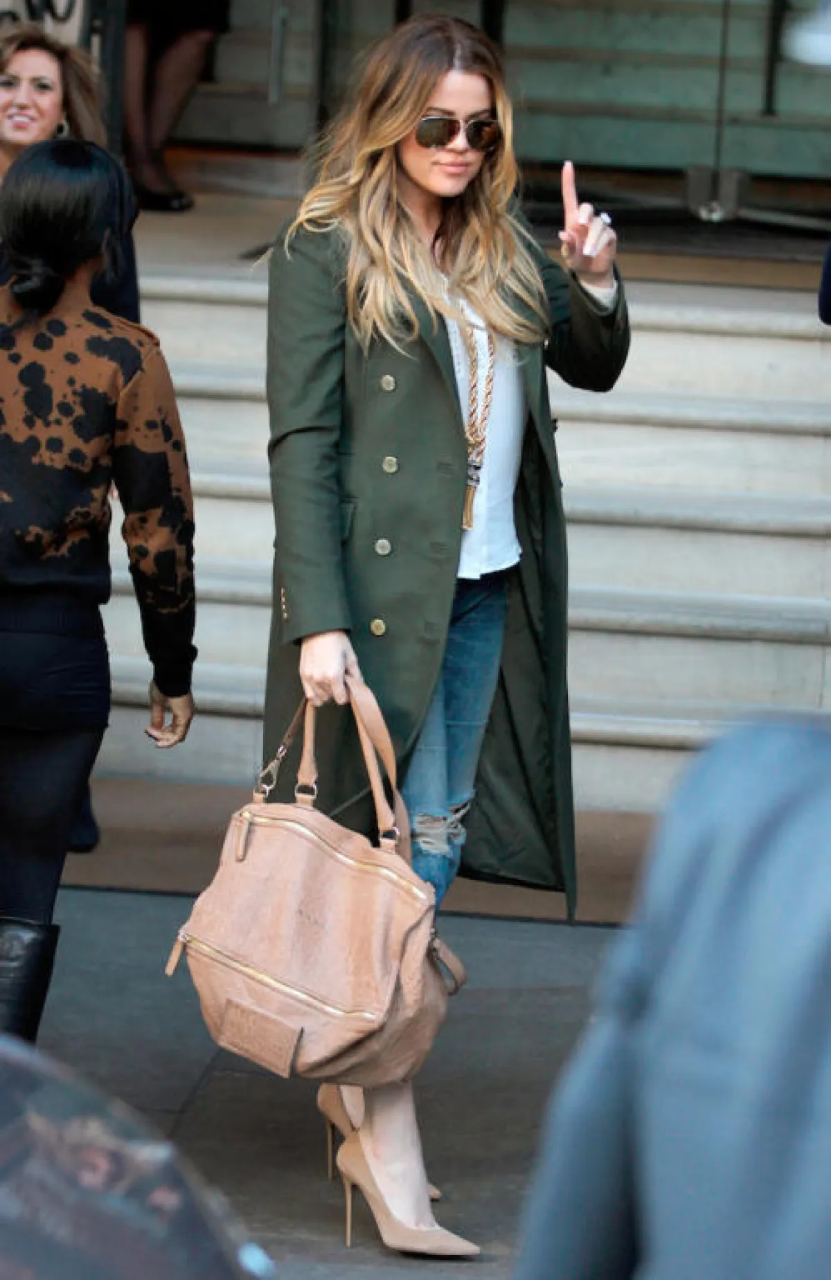 شوهدت كلوي بهذه الإطلالة مؤخَّراً، وقد لفتنا تنسيقها العمليّ الأنيق، حيث ارتدت قميصاً كلاسيكيّاً أبيض اللون مع جينز بسيط، وأكملت إطلالتها بمعطف جميل بلون زيتيّ دافئ وحذاء لحميّ جميل، وقد أعجبنا بلمسة الفخامة التي أضافتها كلوي بقلادتها الذهبيَّة الرائعة.