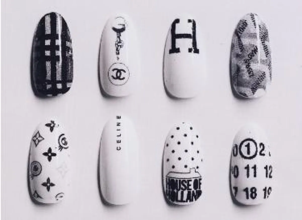 هذه التقنيّة تسمح لك أيضاً باختيار جميع النقوش والاشارات التي تدل على الماركات العالميّة لتزيّني بها اظافرك.