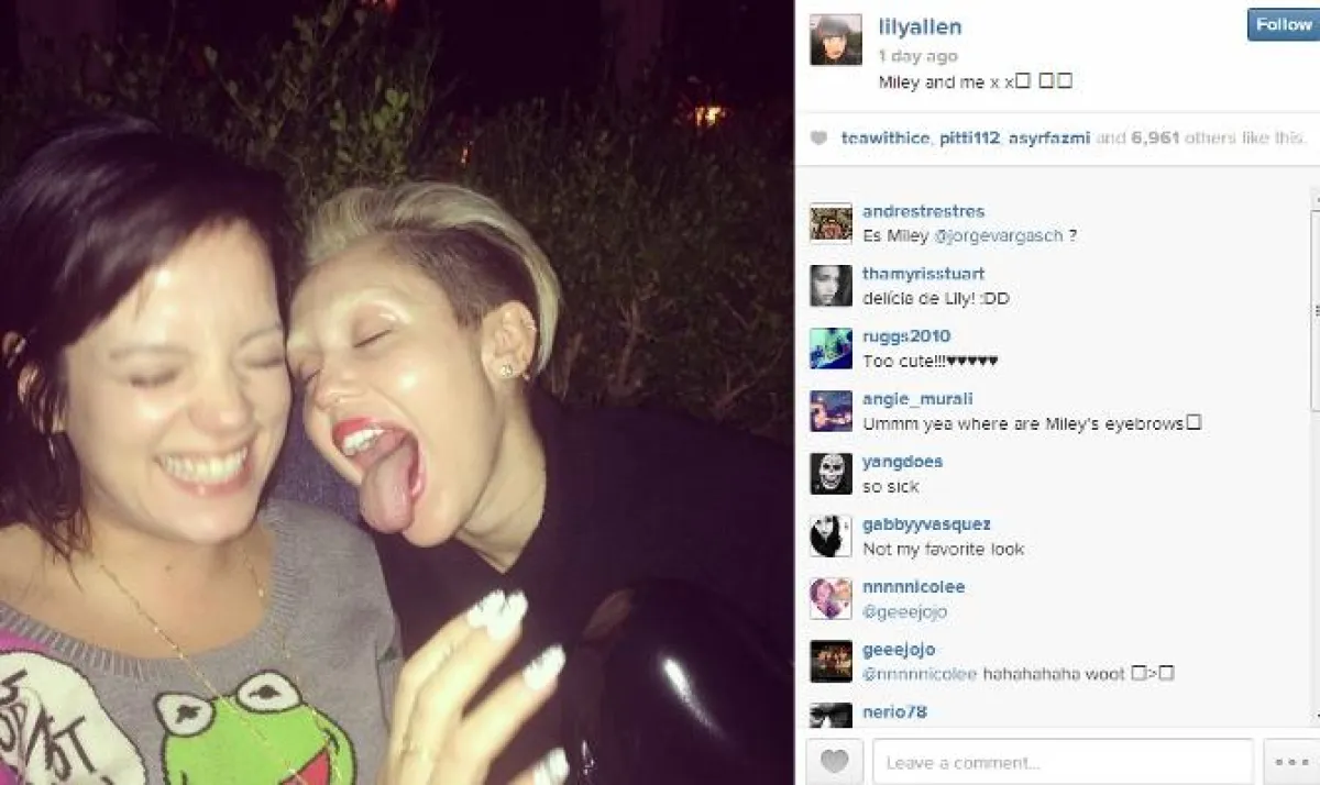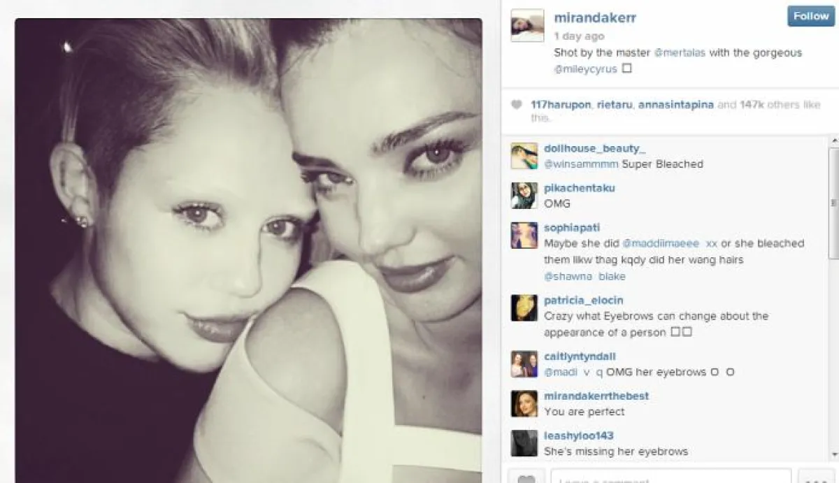 فبعد أن قامت Cyrus البالغة من العمر20 عاماً بصبغ حاجبيها باللون الأشقر الفاتح، ظهرت وكأنّها من دون حواجب في صورة نشرتها المغنية Lily Allen، وهي من أشدّ المعجبين بـCyrus، فيما ظهرت بصورة أخرى جمعتها بعارضة الأزياء Miranda Kerr.