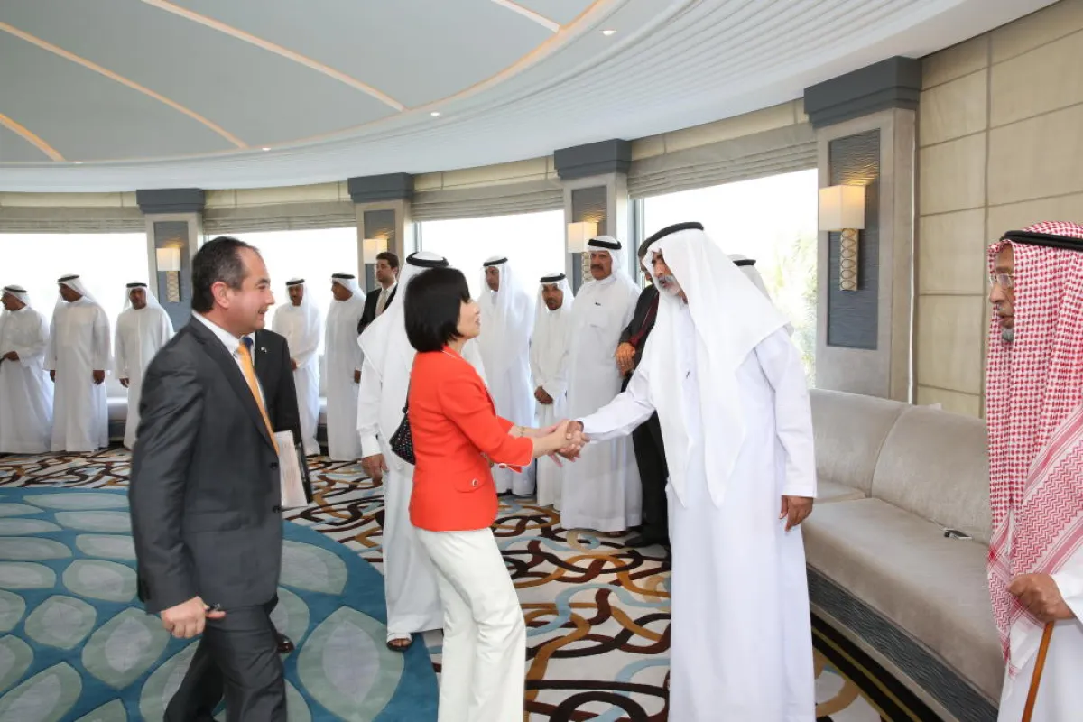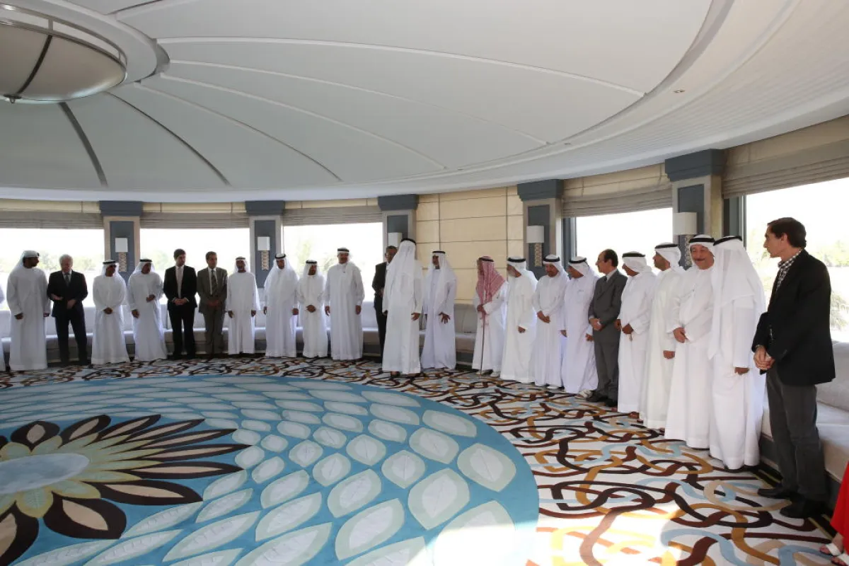 عند وصولنا أبوظبي، في تمام الساعة التاسعة صباحاً، توجهنا مباشرة لحضور مؤتمر اتحاد مصنعي الكابلات العرب، حيث كان الشيخ على معرفة بموعد قدومنا، وما هي إلا لحظات حتى صعد المنبر، وألقى كلمة الافتتاح، وبعد الانتهاء رحّب بنا، ودعانا إلى الركوب بصحبته في سيارته؛ لنرافقه إلى مؤتمر آخر يُعقد تحت رعايته.