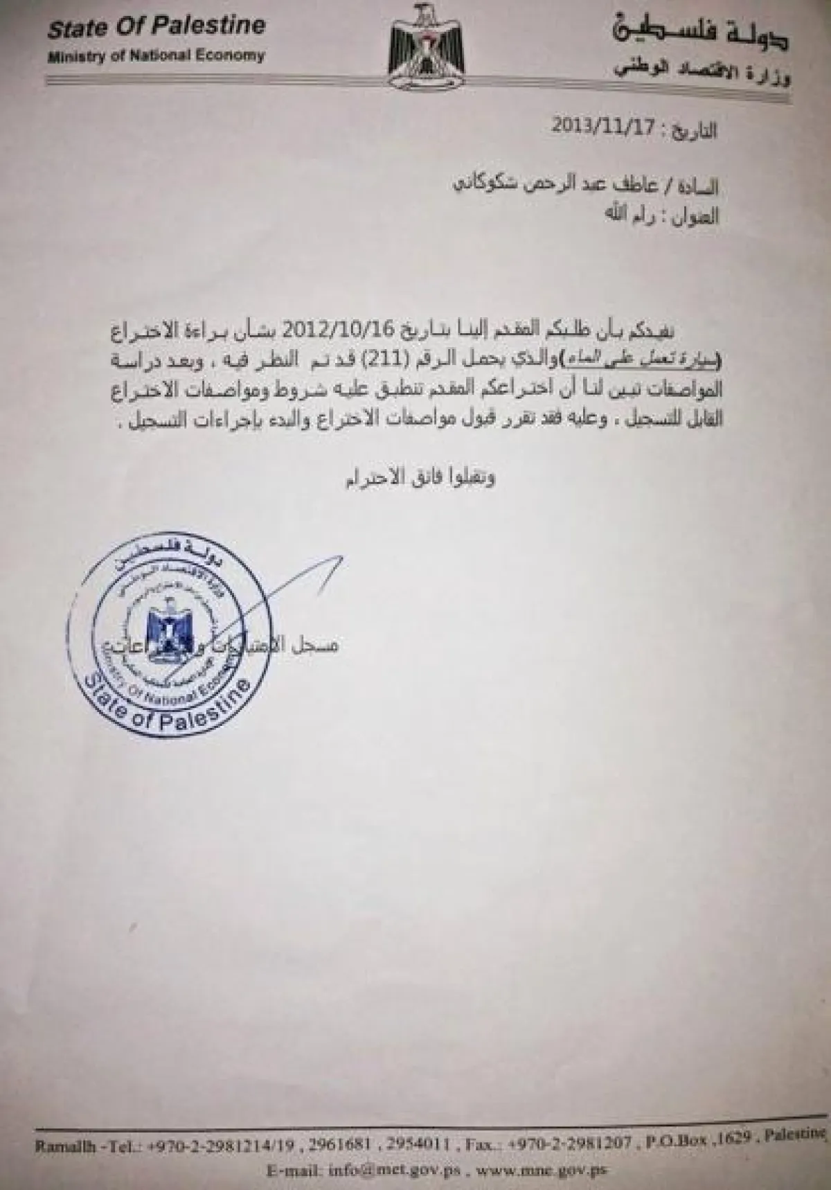 وقد حصل أخيراً على براءة اختراع من وزارة الاقتصاد الفلسطينية، ويبحث حالياً عرض اختراعه على المحافل الدولية وتسجيل اختراعه دولياً ليتم الاستفادة منه على الوجه الأكمل.
