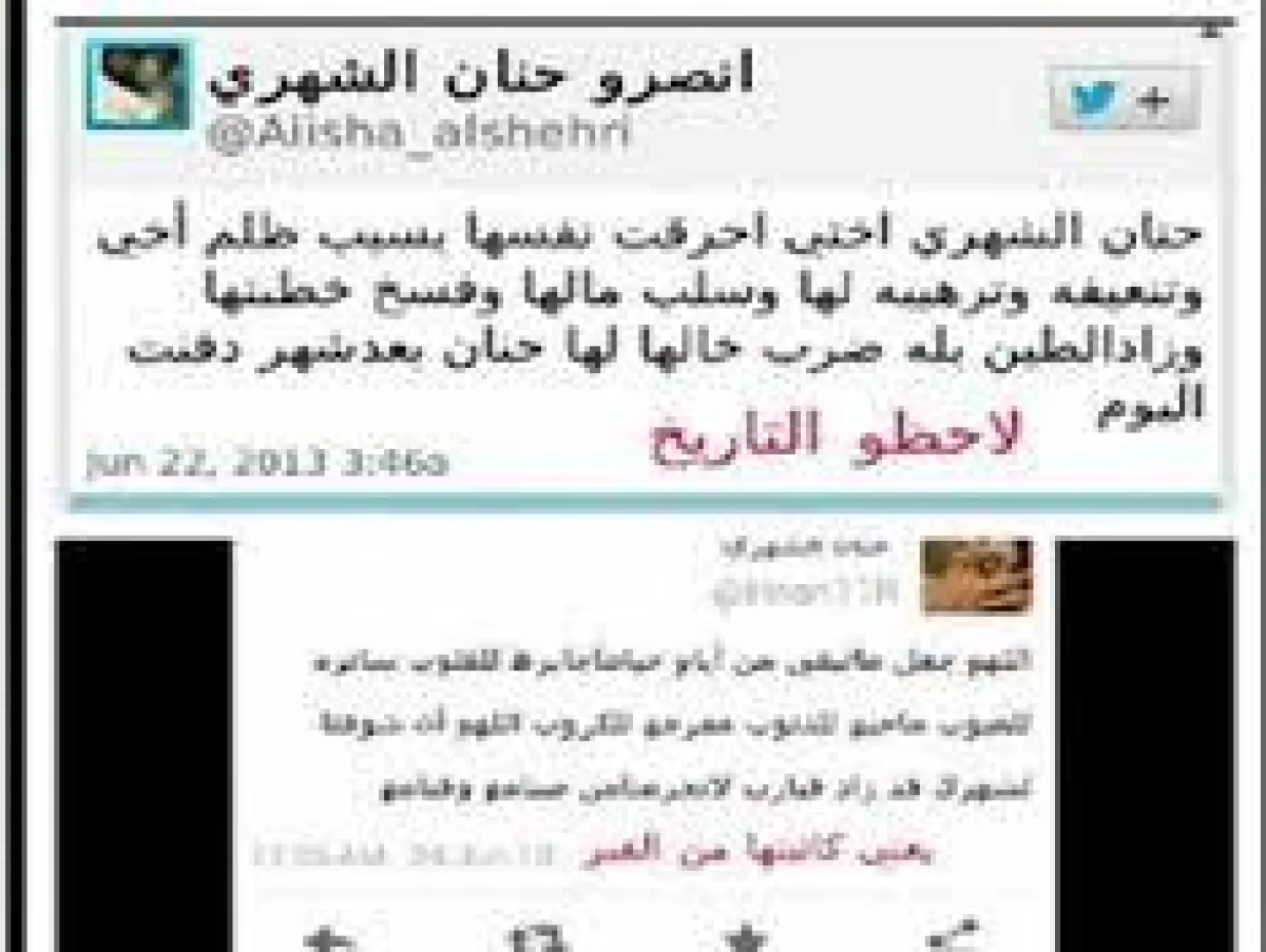 في أول جلسات محاكمة "علي الشهري" المتسبب في انتحار المعنفة "حنان الشهري" حرقاً في شهر رجب الماضي. أصدرت محكمة بيشة العامة مساء أول أمس إسقاط الوصاية عن شقيق المعنقة حنان الشهري، وأخذ التعهدات اللازمة بعدم التعرض لشقيقات حنان (أثير، وهداية، وآمال، وعائشة)، كما يترقب أن يصدر الصك خلال هذا الأسبوع.