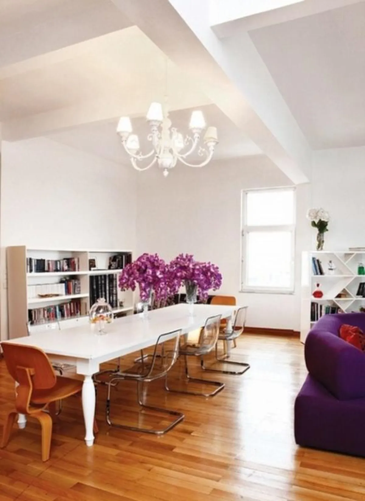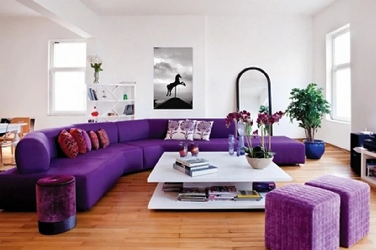 وتطلّ غرفة الطعام على الصالون البنفسجيّ الداكن والرومانسيّ والمكوّن من أريكة _ زاوية بنفسجيّة اللون ومخمليّة الملمس، ومن وسائد مطبوع على وجهها الورد، فيما زيّنت جدران الصالون بلوحات طبيعية لخيولٍ ووجوهٍ معبّرة باللونين الأبيض والأسود، اختارتهما الفنانة من معرض فوتوغرافي في "المركز الثقافي الفرنسيّ".