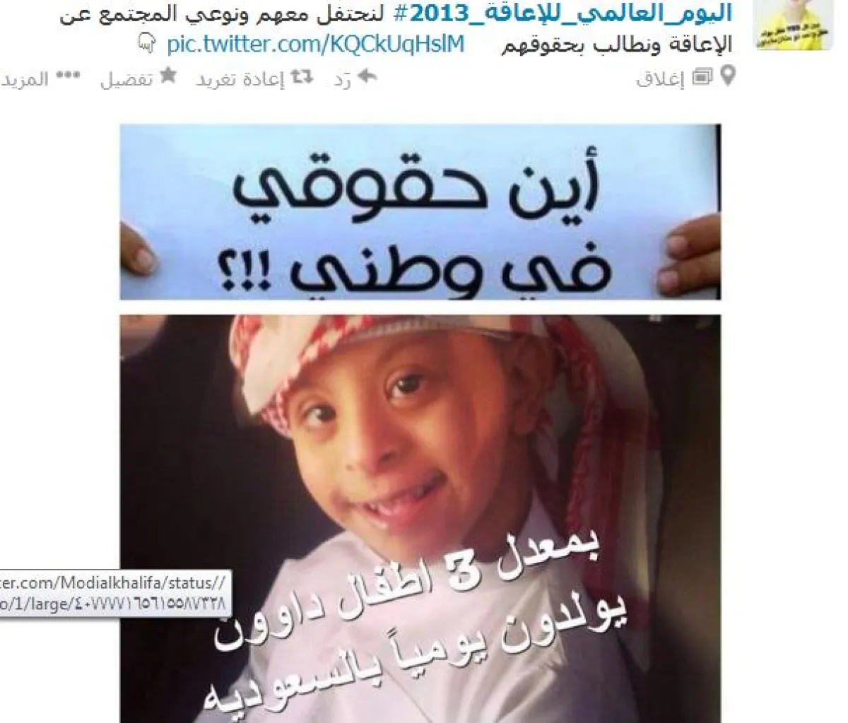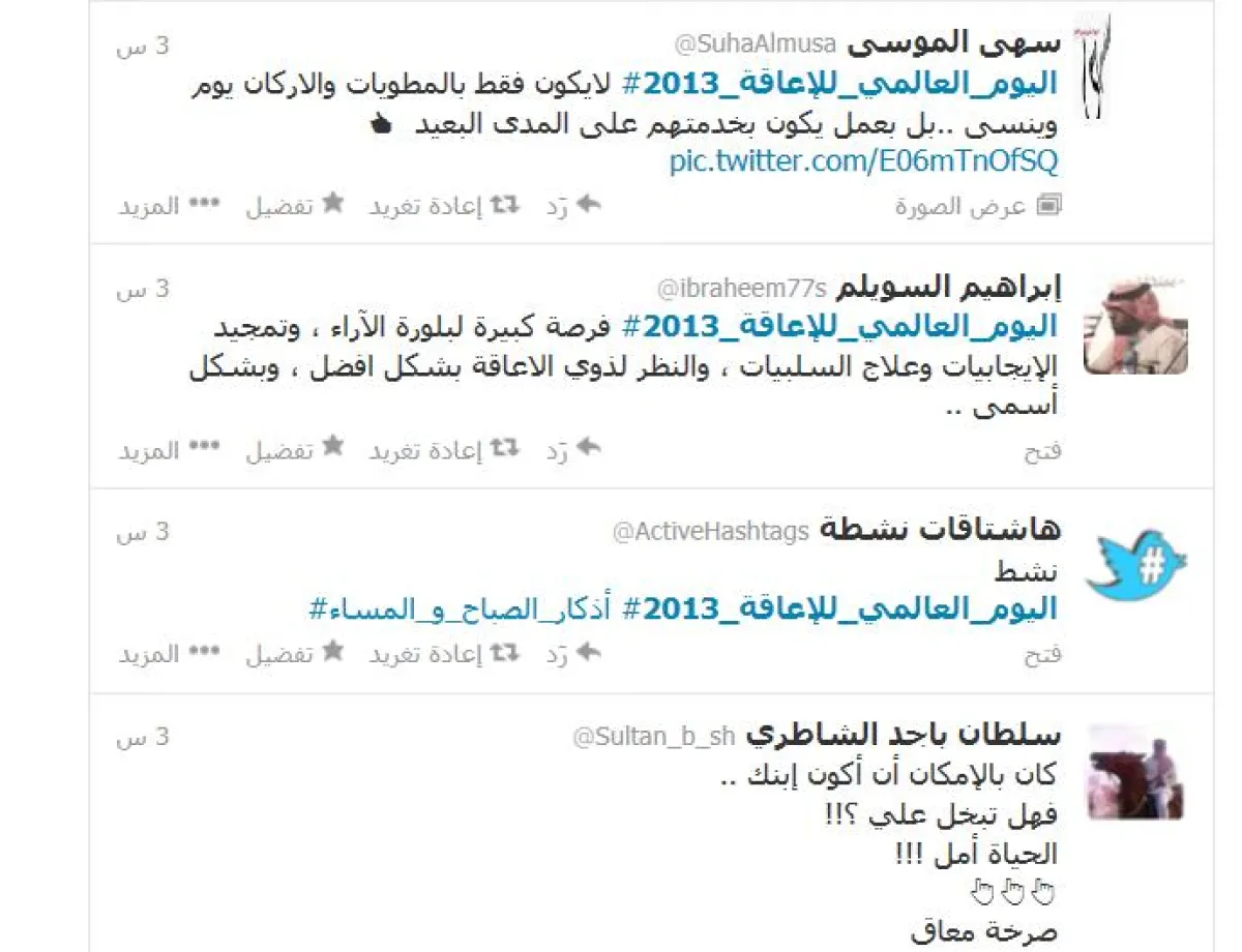 فقد غرد على سبيل المثال المرشد جليس الساحة ‏@jalees55: "#اليوم_العالمي_للإعاقة_2013 يجب أن نحتفل بكل معاق، يجب أن نحسّسوهم بقيمتهم، تجاهل المعاق أمر لايليق بالإنسان، وحقيقة كم معاق أفضل من سليم"، وكتبت Modialkhalifa@: "اليوم_العالمي_للإعاقة_2013 لنحتفل معهم ونوعي المجتمع عن الإعاقة ونطالب بحقوقهم"، وكتب @falcoon2011: أحبتي من ذوي اﻷحتياجات الخاصه نتنفس جمال هذا اليوم الصباح بكم هذا هو يومكم".
