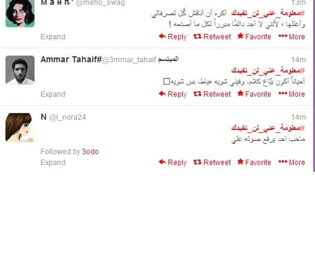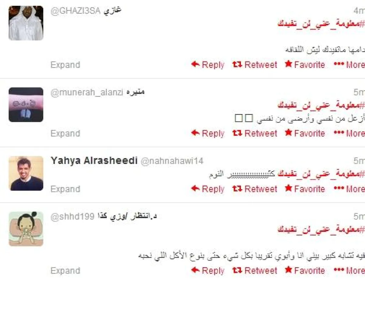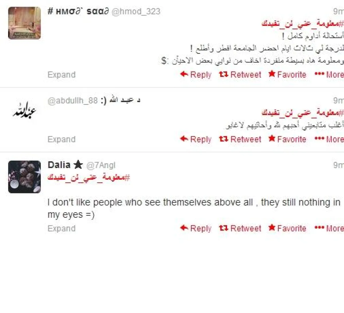 وكتب @Matooq_ : "#معلومة_عني_لن_تفيدك : نسّاي لدرجة كني شايب !". وغردت shahod @ : "#معلومة_عني_لن_تفيدك اكتر انسانه تبرد بسرعه". وكتب just me .. ساخرا @: "انا اممارس عملية الدوام الممل حالياً".