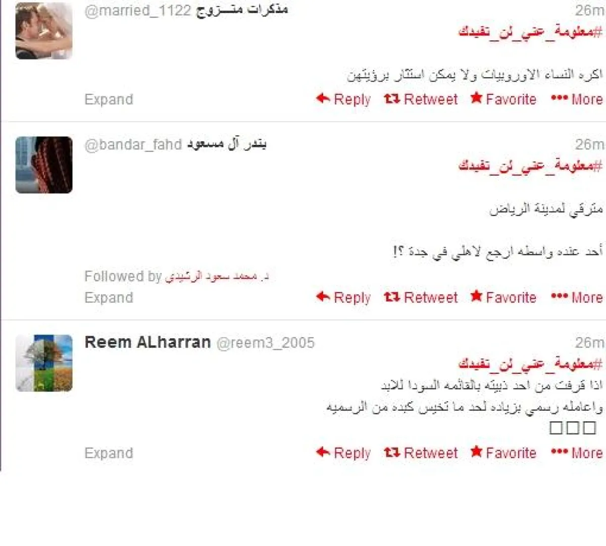 وكتب @married_ ساخراً : "#معلومة_عني_لن_تفيدك اكره النساء الاوروبيات ولا يمكن استثار برؤيتهن".