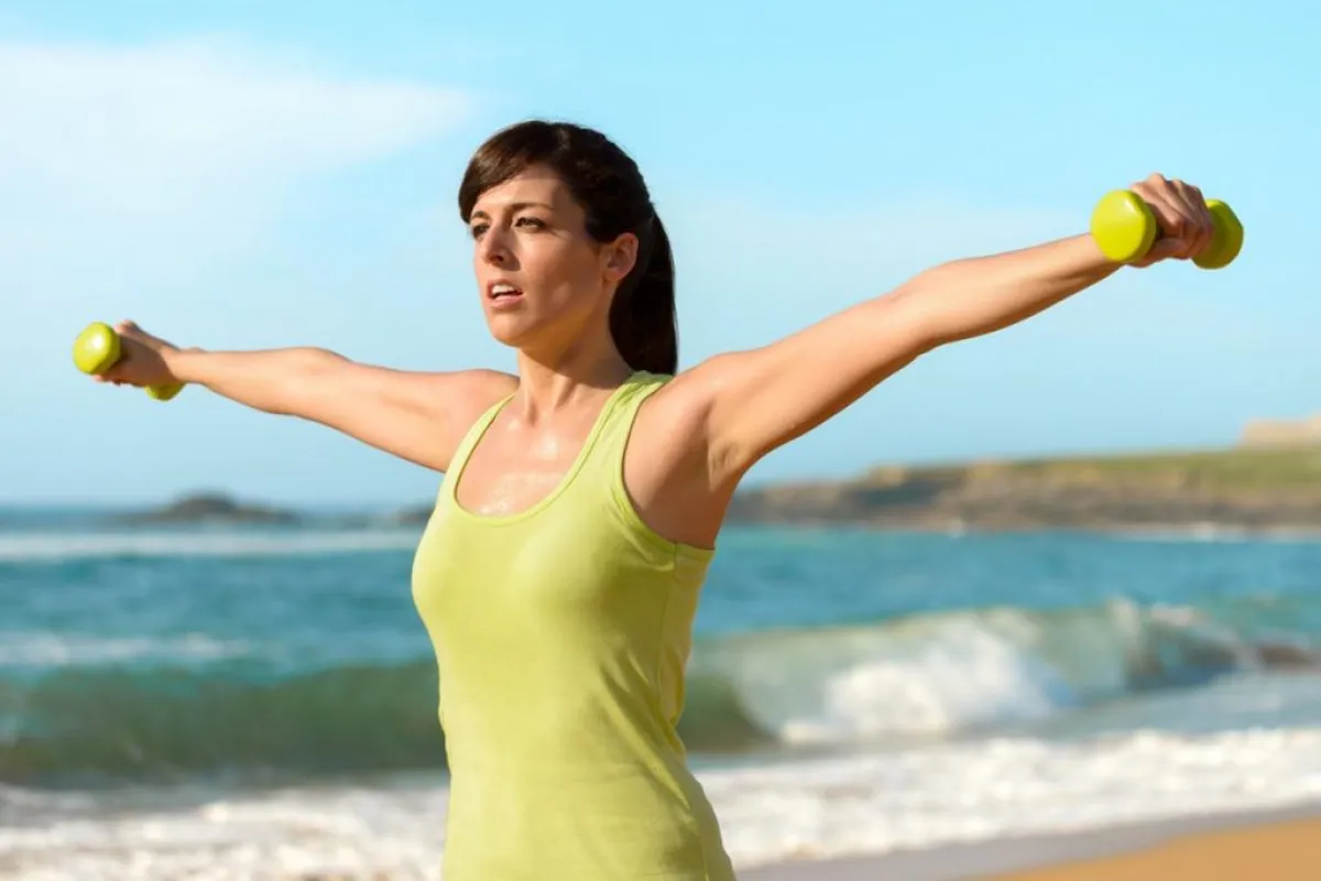 _ ابدئي التمرين وذراعاك متدليتان على جانبيك نحو الأرض، ثمّ اثني ساعدك رافعة الزجاجة إلى أن تلامس كتفك.