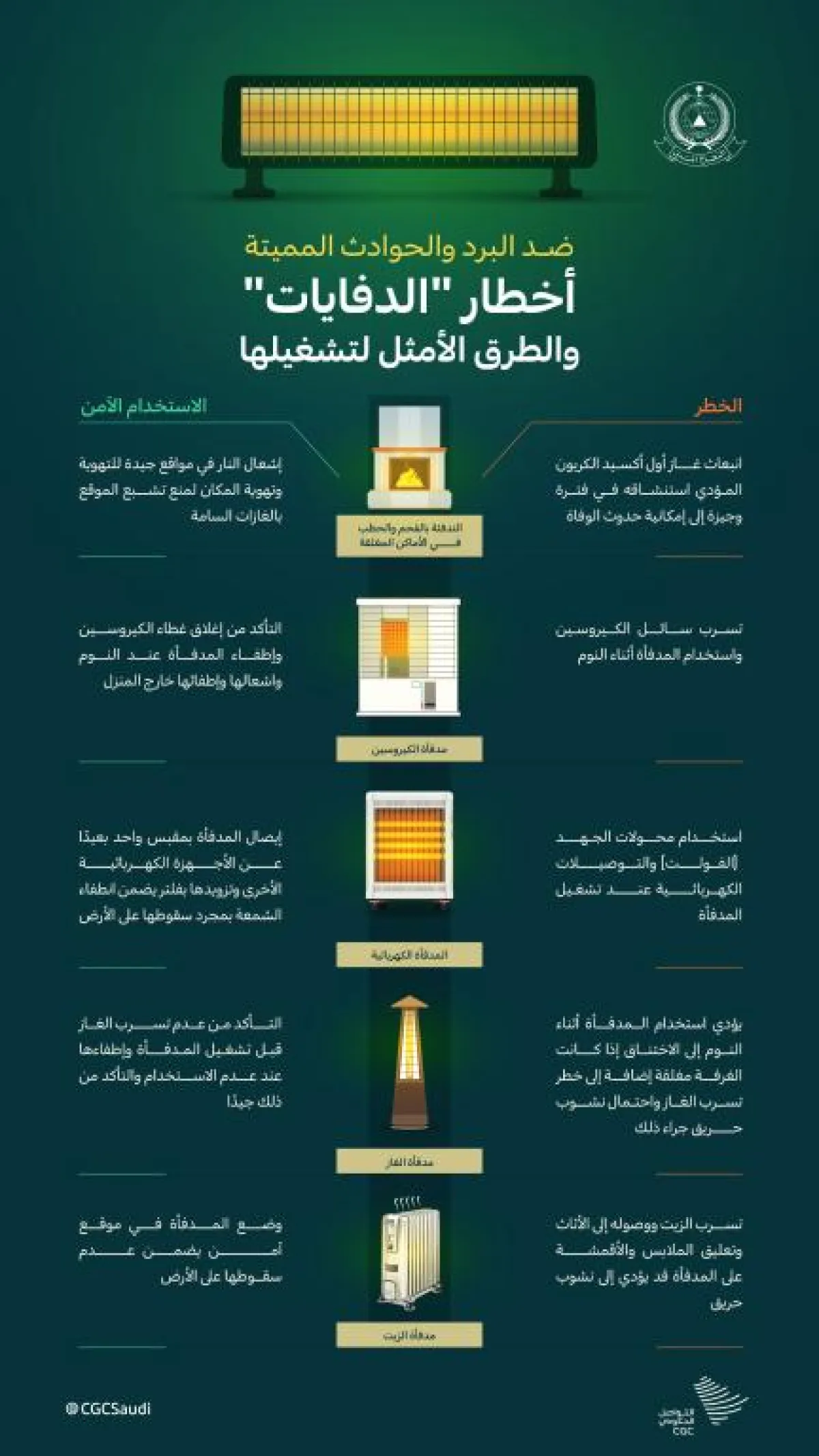 وأبانت المديرية العامة للدفاع المدني، في انفوغراف أن التدفئة بالفحم والحطب في الأماكن المغلقة يترتب عليها انبعاث غاز أول أكسيد الكربون المؤدي استنشاقه في فترة وجيزة إلى إمكانية حدوث وفاة، مشيرةً، إلى أن أفضل الطرق لاستخدام هذا النوع من التدفئة يكون بإشعال النار في مواقع جيدة للتهوية أو تهوية المكان لمنع تشبع الموقع بالغازات السامة.