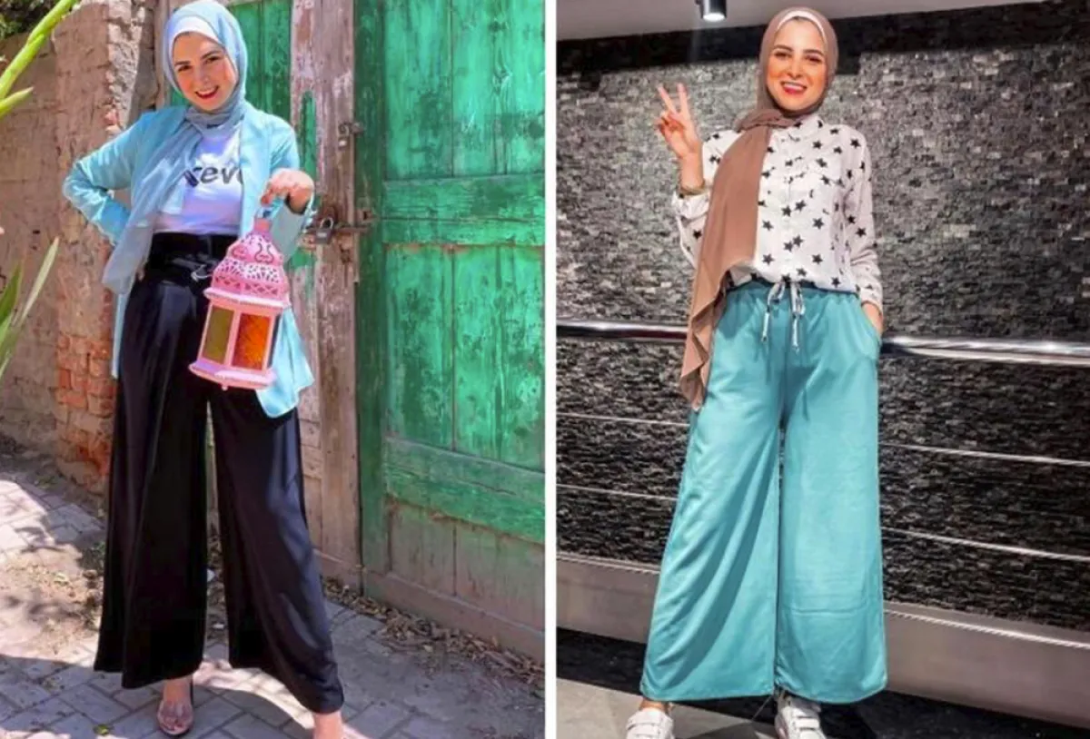 تفضِّل الشابات اللجوء للقطع العصرية غير التقليدية، لذا يمكنك -عزيزتي- استيحاء بعض الأفكار من جهاد البنا، التي أطلت ببنطال أزرق واسع مع قميص أبيض مزين بنجوم سوداء، وأكملت مظهرها بحجاب بني وحذاء رياضي أبيض، وظهرت ببنطال زهري واسع مع قميص أبيض رسمي، وزينت مظهرها بحجاب أبيض مطبع بالرمادي وحذاء بكعب بيج لزي مناسب للعمل، وارتدَتْ في الإطلالة الثالثة بنطالًا وبلوزة واسعين باللون البيج لمظهر خريفي، وأكملت إكسسوارات الإطلالة باللون الأبيض لمظهر حيادي ناعم.