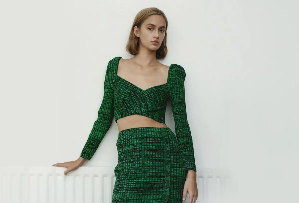 باللون الأخضر الأنيق، قدمت ماركة Self Portrait طقم يتألف من توب قصير بأكمام طويلة وتنورة عمودية مزينة بأزرار مع شق أمامي طويل.