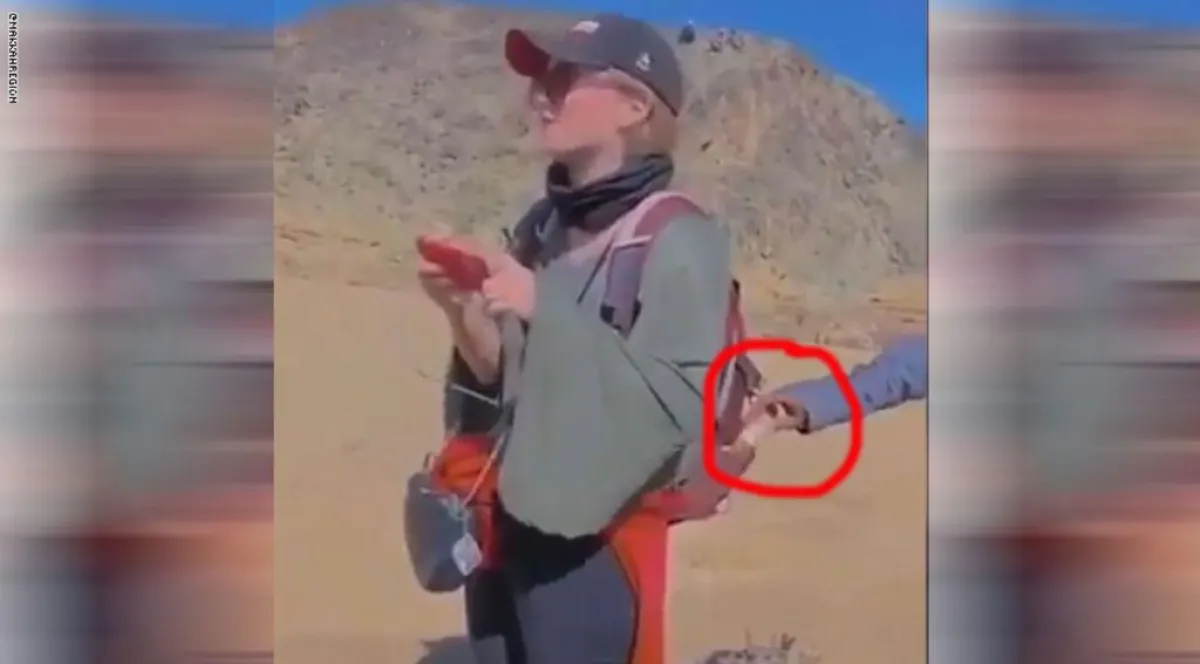 ويظهر في مقطع الفيديو المتداول قيام شخص بمد يده إلى حقيبة ظهر كانت تحملها المتسابقة خلال تصويرها وإخراج غرض من الحقيبة قبل الابتعاد عن موقع الحدث.