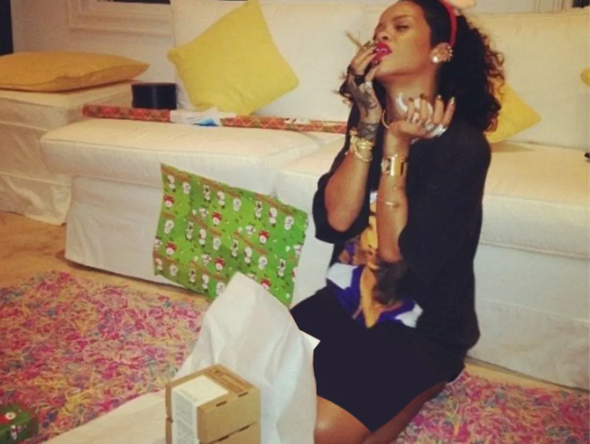 نشرت النجمة Rihanna على صفحتها الخاصّة بموقع التواصل الاجتماعي "إنستغرام" صورة لها، وهي تدخّن سيجارة الحشيش وتحضّر الهدايا وتستمع إلى أغنية النجمة Mariah Carey.