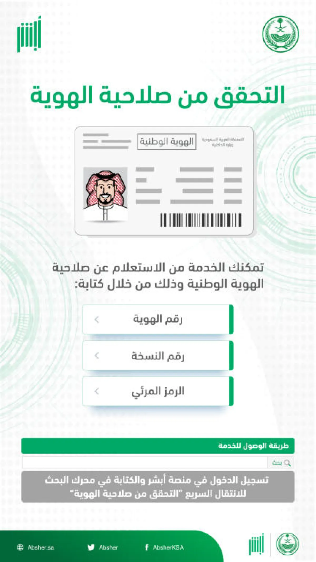 وأشارت منصة "أبشر" إلى أن الخدمة تمكن المستفيد من التحقق من صلاحية الهوية عبر رقم الهوية ورقم النسخة والرمز المرئي.