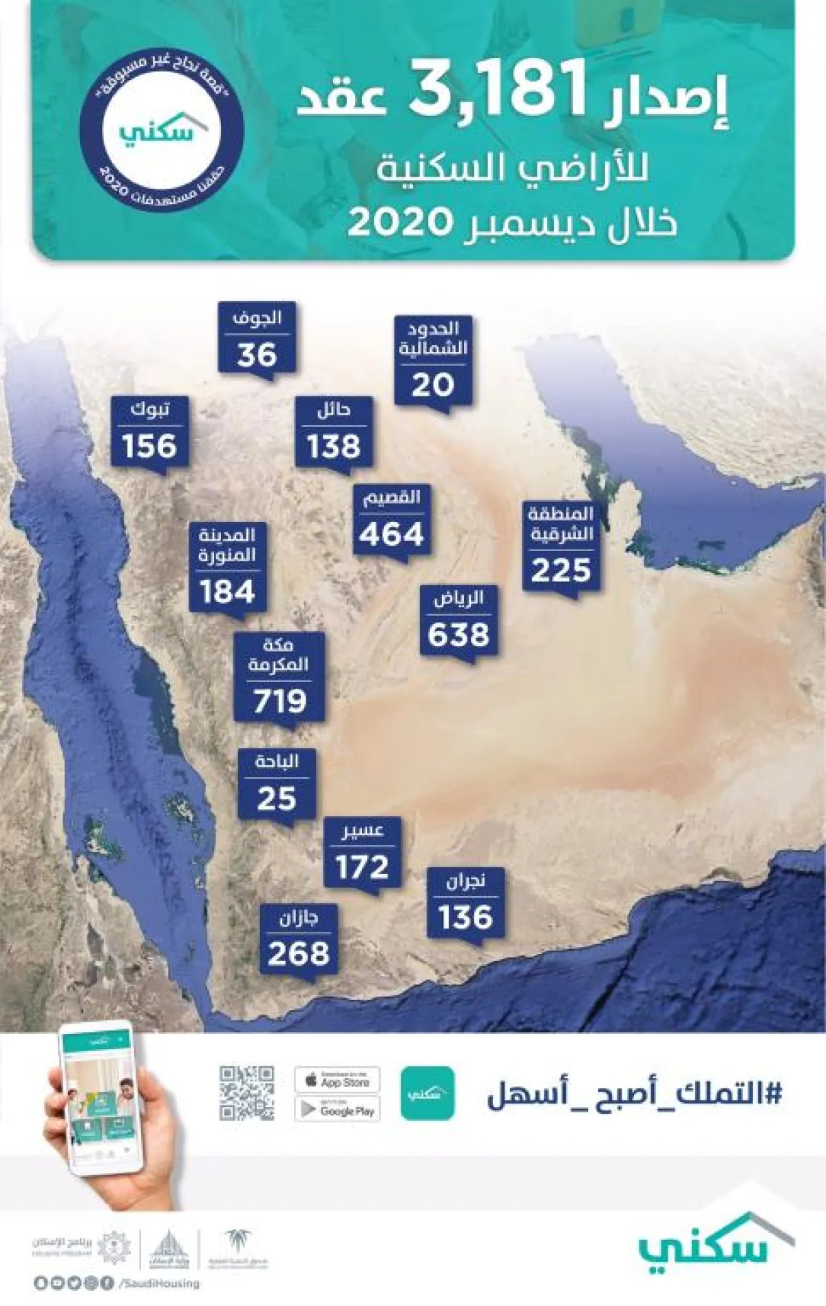 وفي التفاصيل، فقد أصدر برنامج "سكني" 3181 عقداً جديداً للأراضي السكنية للمستفيدين من البرنامج خلال شهر ديسمبر الماضي، وذلك ضمن الخيارات والحلول السكنية المتنوعة التي يتيحها البرنامج لتسهيل تملّك الأسر السعودية بهدف زيادة نسبته إلى 70% تماشياً مع مستهدفات برنامج الإسكان أحد برامج رؤية المملكة 2030-.