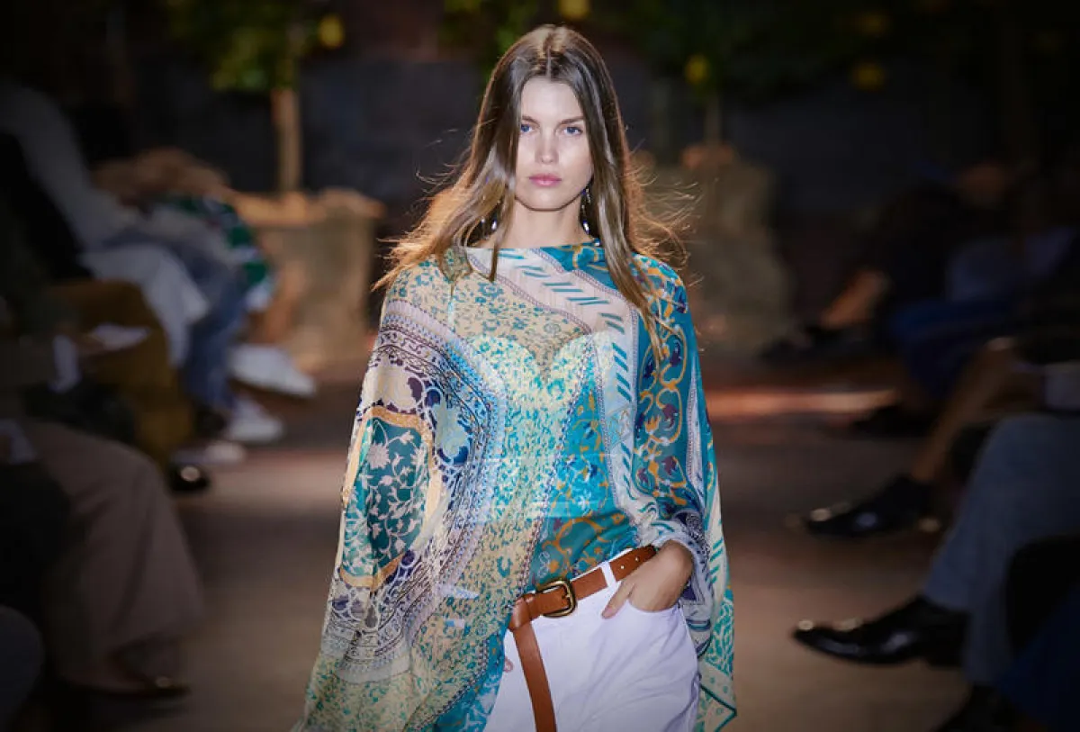أو من خلال فستان من قماش الشيفون بطبعاته المتعددة من إيترو Etro، والذي يعد مثالياً لسهرات الصيف الحارة، نسقي مع هذه الإطلالة صندلاً باللون الذهبي، واعتمدي تسريحة شعر ناعمة بالشعر المفلوت.