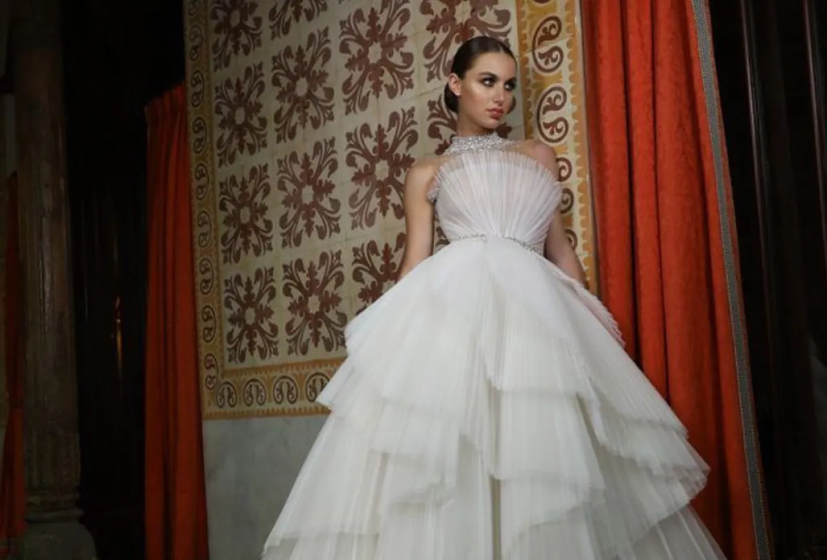 اختار مصمم الأزياء اللبناني جورج حبيقة تصميم الفستان المنفوش بشكل متدرج والياقة العالية لعروس 2021، وتميزت الياقة بتصميمها اللامع والبراق. تليق هذه الفساتين بالعروس الطويلة.