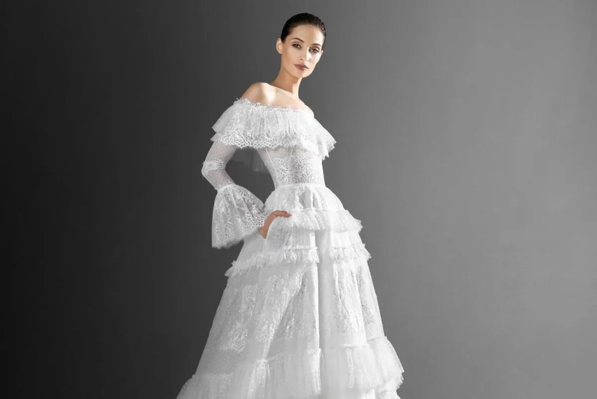 اعتمدت سيرين عبد النور فستان أبيض ناعم بقصّة أوف شولدر وبقماش الدانتيل مع تنورة طبقات تتسع من أسفل.