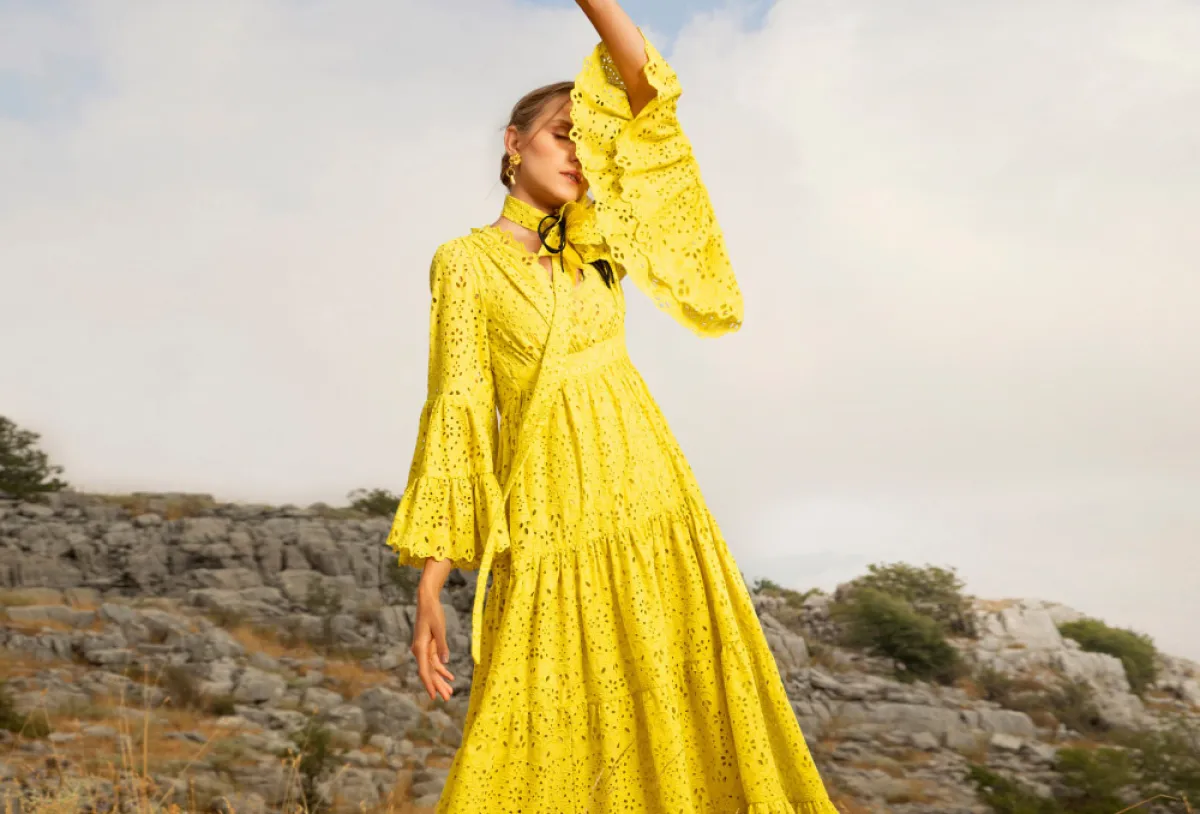 رأينا فساتين السهرة باللون الأصفر بتصميمات خلابة تراوحت بين القصيرة والميدي والطويلة بتصميماتها المحتشمة والمفعمة بالرقي؛ أما في ما يخص خاماتها، فقد تناثرت كالفراشات على منصات العروض خلال أسابيع الموضة العالمية.