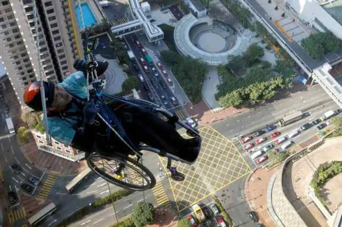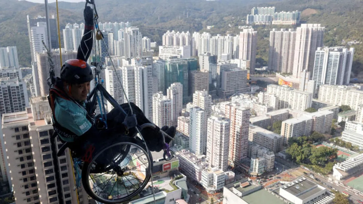 وتمكن «لاي تشي واي» من تسلق أكثر من 250 مترا من واجهة ناطحة سحاب، وهو مربوط بكرسي متحرك، وذلك من أجل جمع التبرعات لعلاج مرضى إصابات الحبل الشوكي.