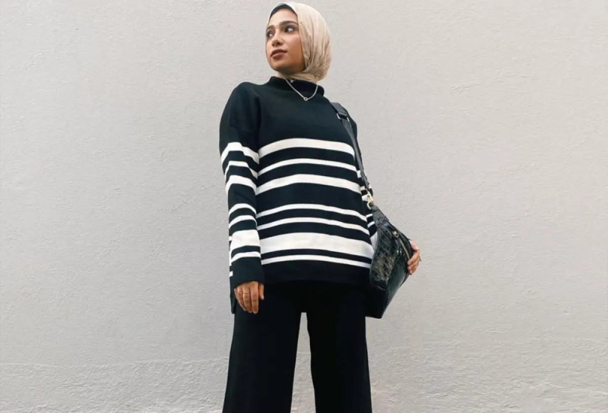 يُعد البنطال الواسع القطعة الأكثر ملاءمة للمحجبات، ولأنه برز بشكل كبير في صيحات الموضة فيمكنك اعتماده بعدة تنسيقات، ومنها تأنقت دينا مراد ببنطال وبلوڤر باللون الأسود مع قميص أبيض تقليدي، وأكملت مظهرها بإكسسوارات حيادية اللون لمظهر عملي ناعم، وفي إطلالة أخرى ظهرت ببنطال أسود واسع مع بلوزة سوداء مخططة عرضيًّا بالأبيض، لتمنحها إطلالة مثالية مناسبة لذوات القوام النحيل.