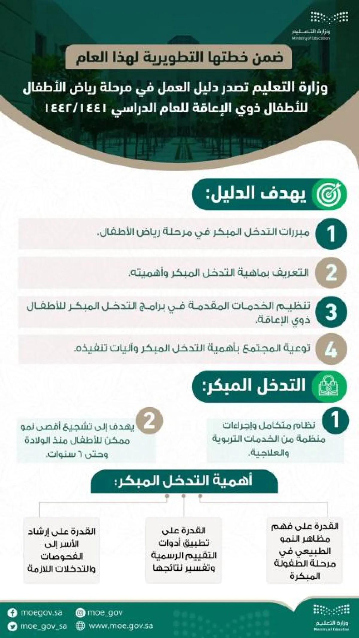 وجاء الدليل استجابةً لرغبة القائمين على رعاية الأطفال ذوي الإعاقة بوزارة التعليم وأولياء أمورهم، والرقي بتقديم الخدمات التعليمية لهم، وتحقيقاً لتطلعات وزارة التعليم في تطوير العملية التربوية والتعليمية في مجال التربية الخاصة.