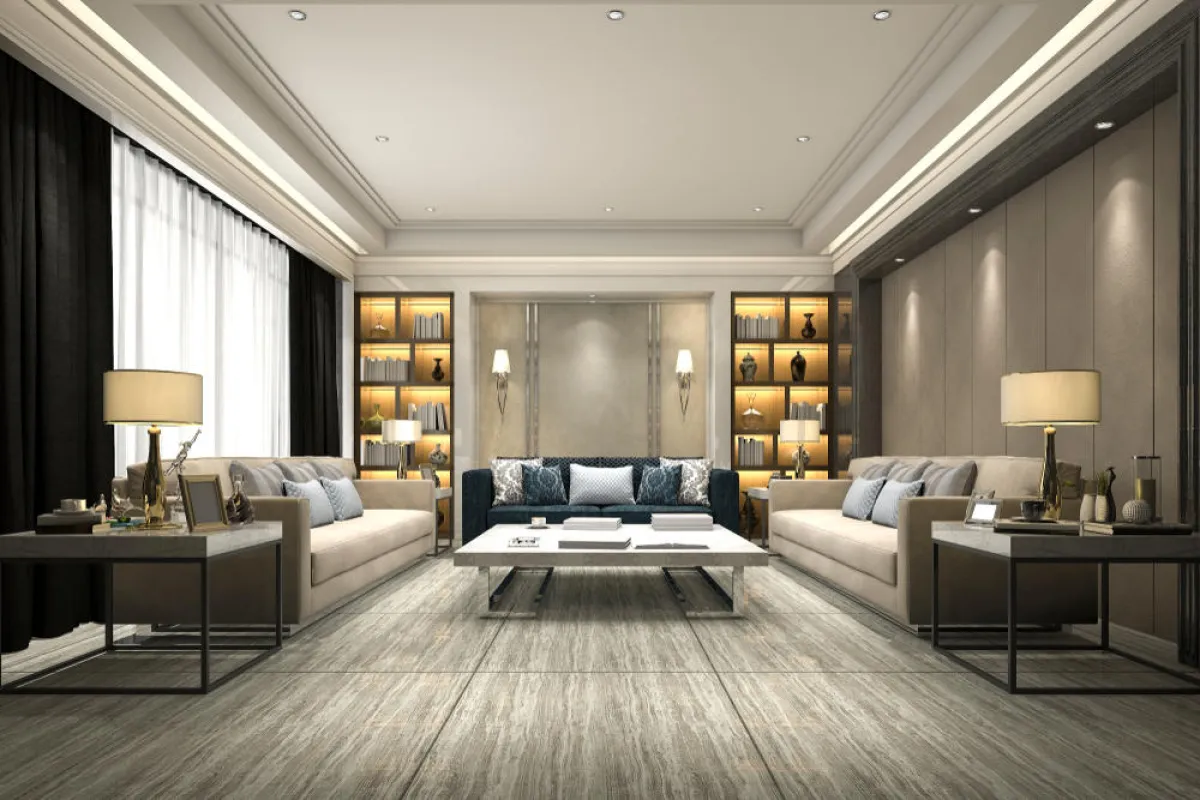 • تصمم حافة حول السقف لحمل الإنارة مع تثبيت عارضات مستطيلة تغطي السقف الرئيس، وتطلى بلون الخشب، بالانسجام مع الأثاث والأرضية.