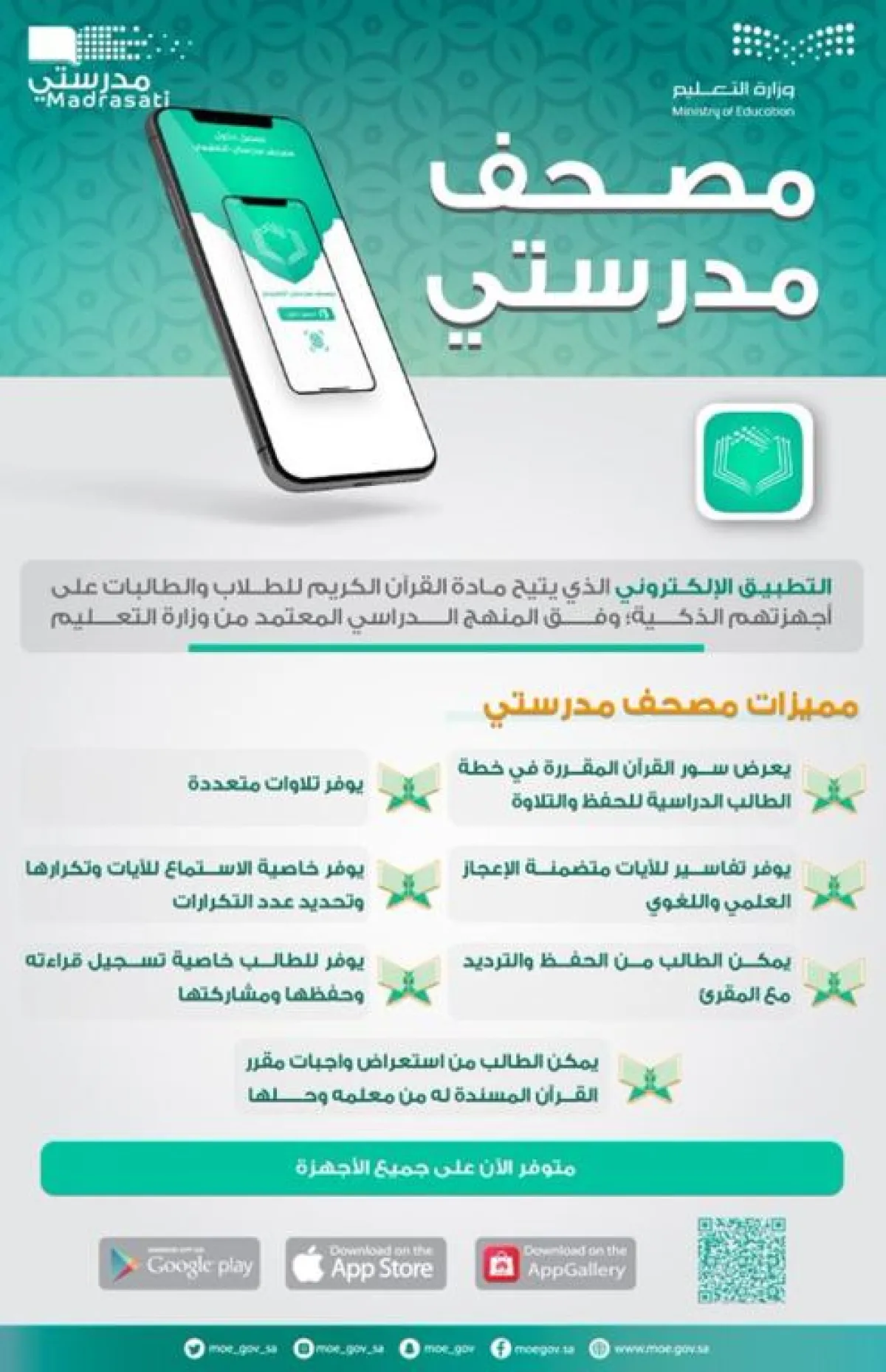 أعلنت وزارة التعليم عبر حسابها الرسمي على موقع التدوينات المصغر "تويتر" إطلاق تطبيق "مصحف مدرستي" الذي يتيح مادة القرآن للطلاب والطالبات على أجهزتهم الذكية وفق المنهج الدراسي المعتمد من وزارة التعليم.