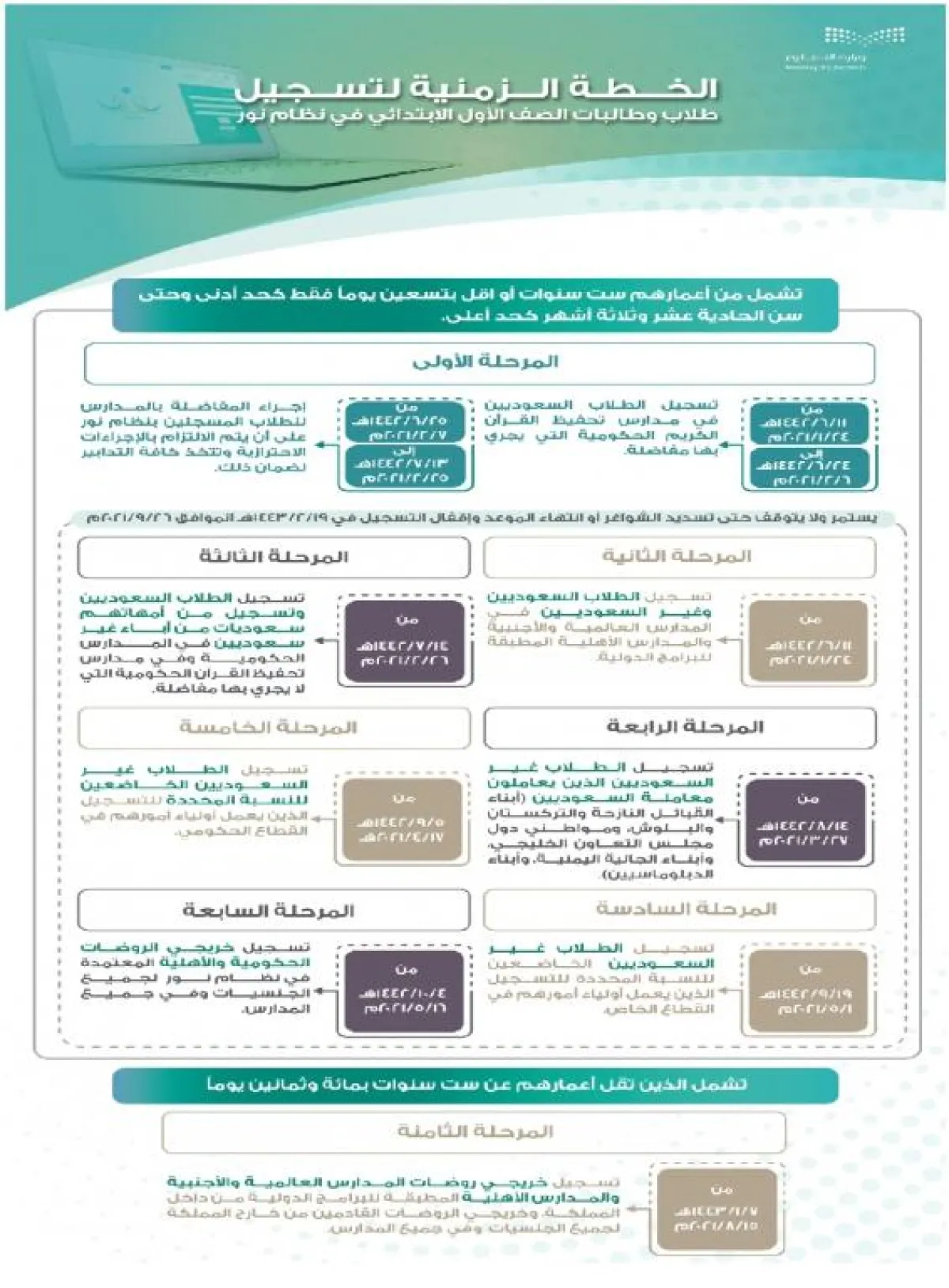 ويبدأ تسجيل من تقل أعمارهم عن ست سنوات بـ180 يومًا من خريجي الروضات الحكومية والأهلية المعتمدة في نظام نور لجميع الجنسيات، وفي جميع المدارس يوم 4/10/1442هـ، وتسجيل خريجي روضات المدارس العالمية والأجنبية والمدارس الأهلية المطبقة للبرامج الدولية من داخل المملكة، وخريجي الروضات القادمين من خارج المملكة لجميع الجنسيات وفي جميع المدارس يوم 7/1/1443هـ، كما يستمر التسجيل حتى سد الشواغر أو انتهاء الموعد وإقفال التسجيل في 19/2/1443هـ.