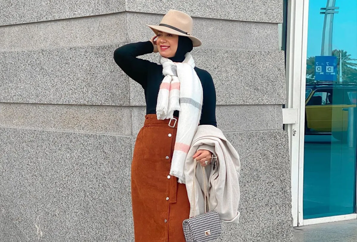في إطلالة كاجوال نهارية، اعتمدت مدونة الموضة المصرية علا عبد الحميد التنورة المخمل بتصميم A line باللون الجملي، ونسقتها مع بلوفر أسود، وسكارف من الصوف باللون الأبيض مع خطوط باللونين الوردي والرمادي.