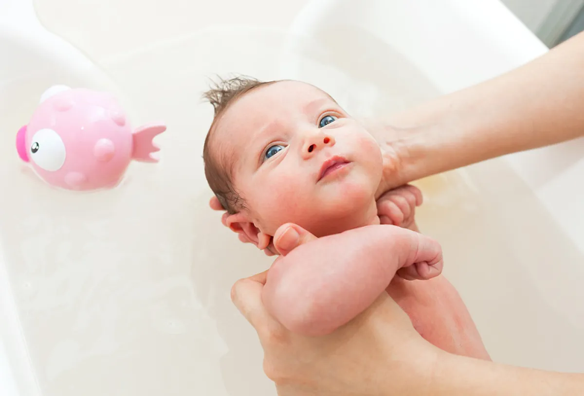 - ويمكن للمولود أن يحصل على حمامه الأول بعد وضع غطاء السرة المناسب والمخصص لها.