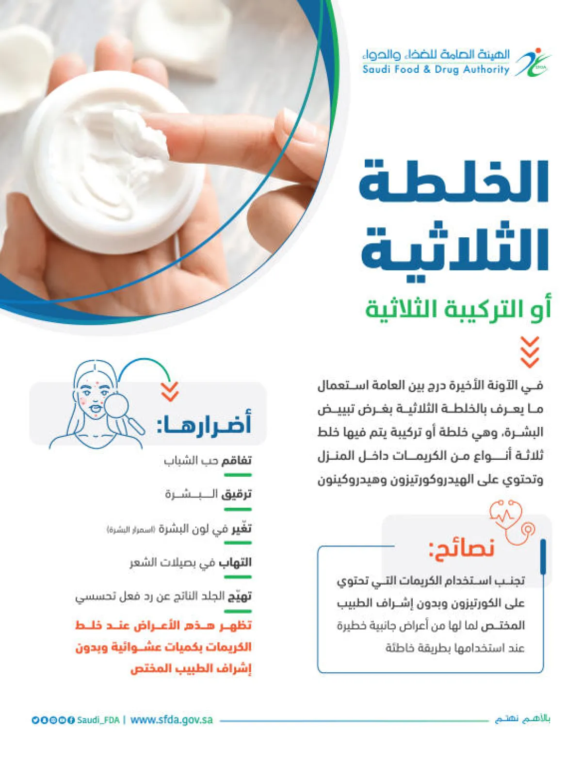 وفي هذا الصدد، فقد حذرت الهيئة العامة للغذاء والدواء، عبر حسابها الرسمي على موقع التدوينات المصغر "تويتر"، من خطورة استخدام "الخلطة الثلاثية" أو "التركيبة الثلاثية" لتبييض البشرة، مشيرة، إلى وجود 5 أضرار على الجلد من استخدامها.