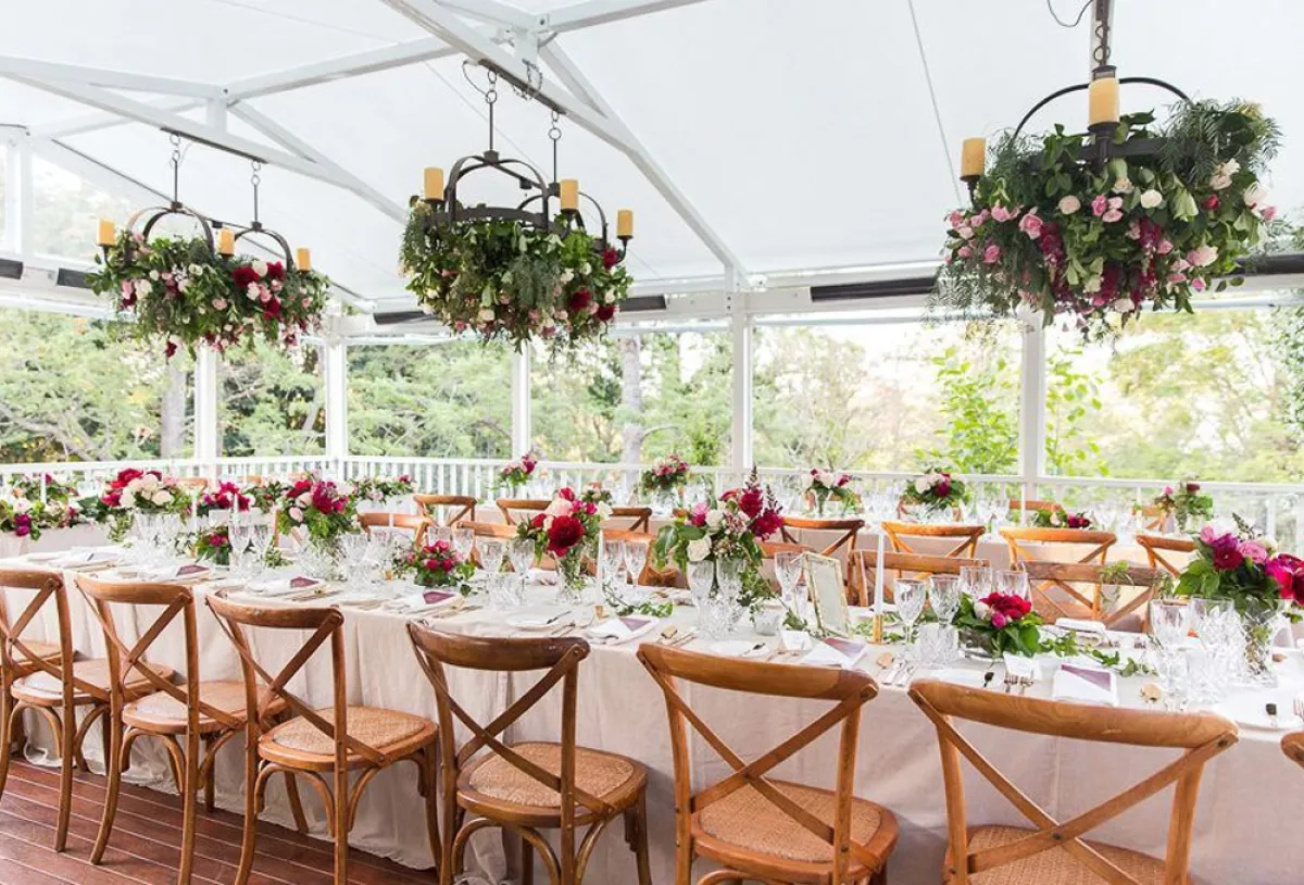 ثيم زفاف بالثريات التي تتدلى منها أحواض الزهور الملونة