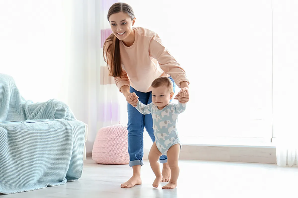 زيدي ثقة طفلكِ بنفسه، والتي تعد العامل الأساس وفري له بيئة آمنة من حوله قدر الإمكان، كأن تختاري غرفة مفروشة بالسجاد يبدأ تعلم المشي بها.