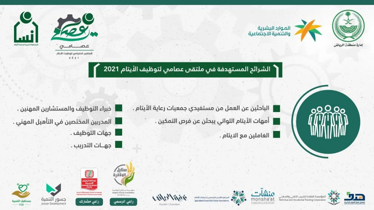 يدشن اليوم أمير منطقة الرياض رئيس مجلس إدارة جمعية إنسان لرعاية الأيتام أول منصة إلكترونية مخصصة لتأهيل وتوظيف الأيتام من الذكور والإناث في المملكة وذلك ضمن انطلاقة فعليات ملتقي عصامي الافتراضي لتوظيف الأيتام بالمملكة الذي تنظمه "إنسان" بمشاركة عدد من جمعيات رعاية الأيتام في المملكة بجانب صندوق الموارد البشرية (هدف)، والمؤسسة العامة للتدريب التقني والمهني والمجلس التخصصي الفرعي لجمعيات الأيتام والهيئة العامة للمنشآت الصغيرة والمتوسطة "منشآت " بالإضافة الى عدد من الشركات والمؤسسات الخاصة حيث أوضح مدير عام الجمعية المكلف أ.سامي بن محمد الزيدان أن الملتقي الذي سوف يستمر لمدة 7 أيام يشتمل على تنظيم عدد من الفعاليات منها ورش عمل نوعية للباحثين عن الوظائف بالتعاون مع الجهات والخبرات في مجال تدريب وتأهيل الموارد البشرية، كذلك إقامة منتدى تقدم فيه أوراق عمل من المختصين من مختلف الجهات والشركات والمؤسسات في القطاع العام والخاص