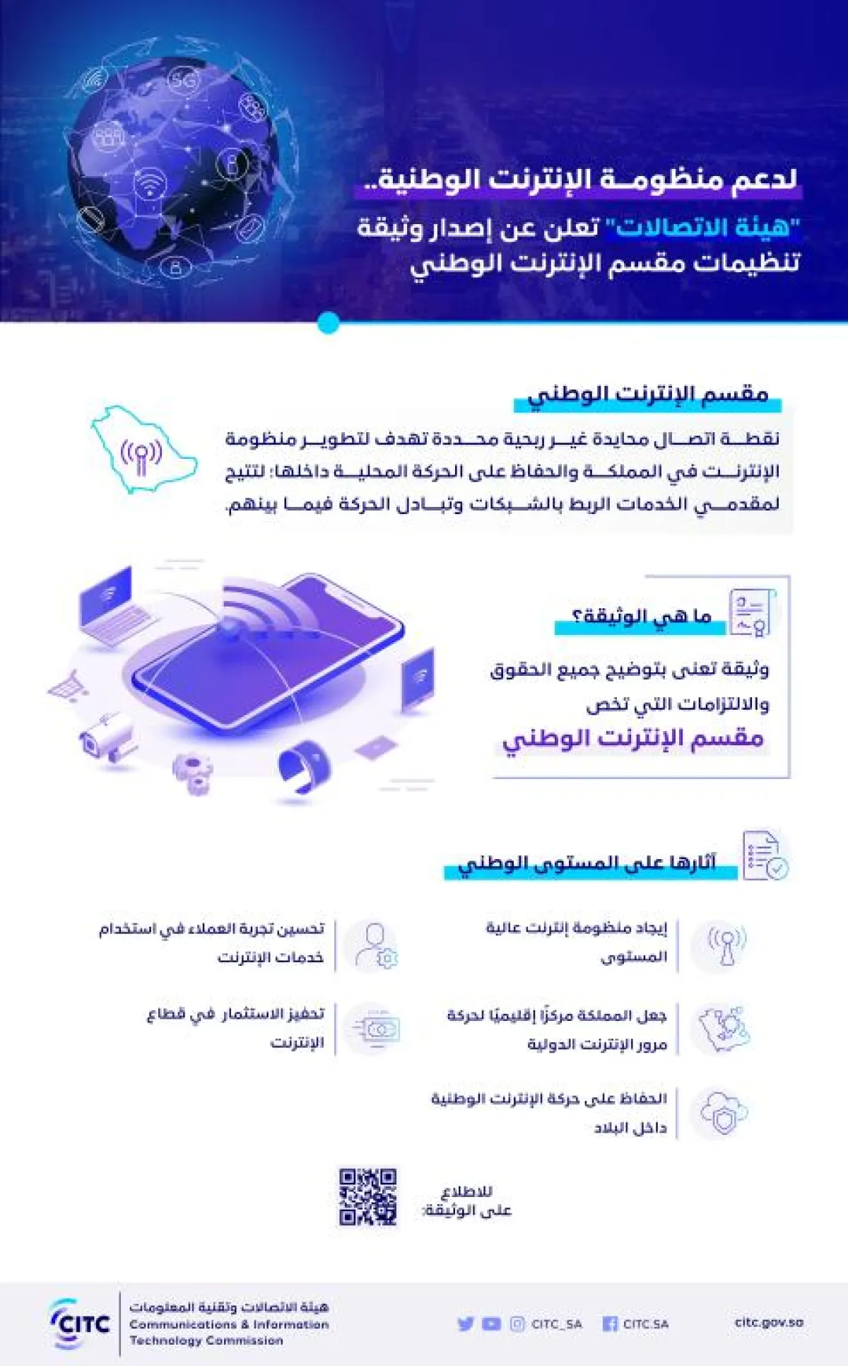 وأبانت هيئة الاتصالات وتقنية المعلومات، في انفوغراف عبر حسابها الرسمي على موقع التدوينات المصغر "تويتر" أنها تسعى من خلال هذه الوثيقة إلى جعل المملكة العربية السعودية مركزًا إقليميًا لحركة مرور الإنترنت الدولية والحفاظ على حركة الإنترنت الوطنية داخل البلاد، وتحسين تجربة العملاء في استخدام خدمات الإنترنت، وتحفيز الاستثمار.