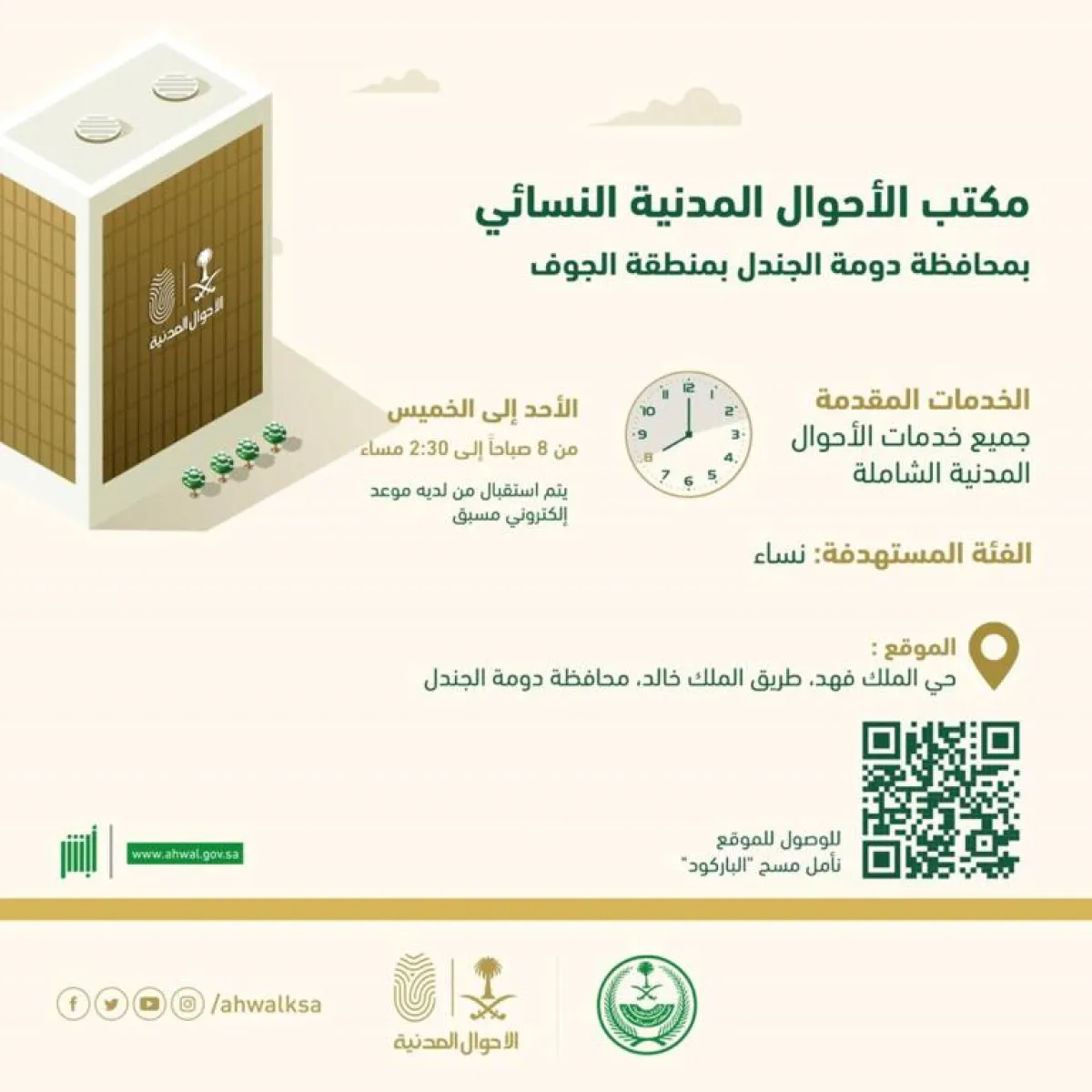 وفي سياق أخر، فقد أعلنت وكالة وزارة الداخلية للأحوال المدنية تدشّن مكتباً نسائياً جديداً بمنطقة الجوف في محافظة دومة الجندل، لتقديم خدمات السجل المدني للمواطنات، وتم إدراجه في نظام المواعيد الإلكترونية على منصة "أبشر" الإلكترونية لاستقبال طلبات المستفيدات.