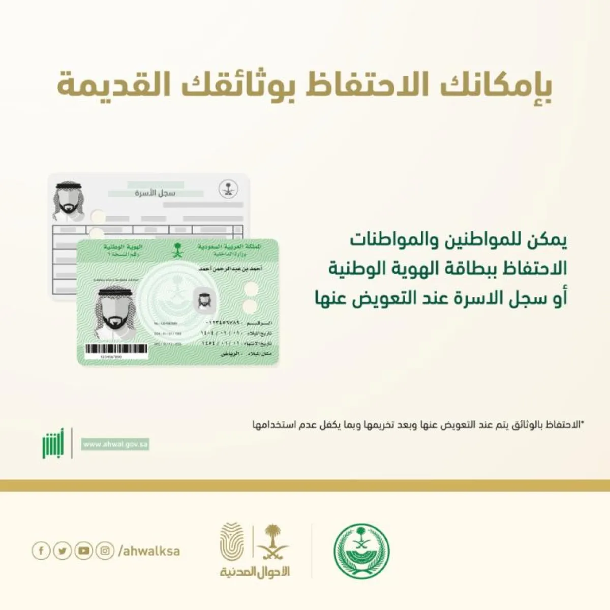 صرحت الأحوال المدنية عبر موقع التواصل"تويتر" بإنه يمكن للمواطنين والمواطنات الاحتفاظ ببطاقة الهوية الوطنية أو سجل الأسرة عند التعويض عنها.