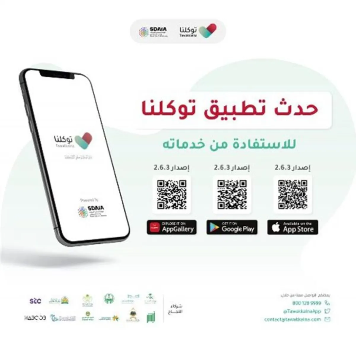 نشر تطبيق توكلنا عبر حسابه الرسمي على موقع التدوينات المصغر "تويتر"، انفوغراف دعا من خلاله إلى تحديث التطبيق للإصدار (2.6.3)، على متاجر آب ستور، وغوغل بلاي، وآب غالاري، وذلك للاستفادة من خدمات التطبيق بشكل كامل.