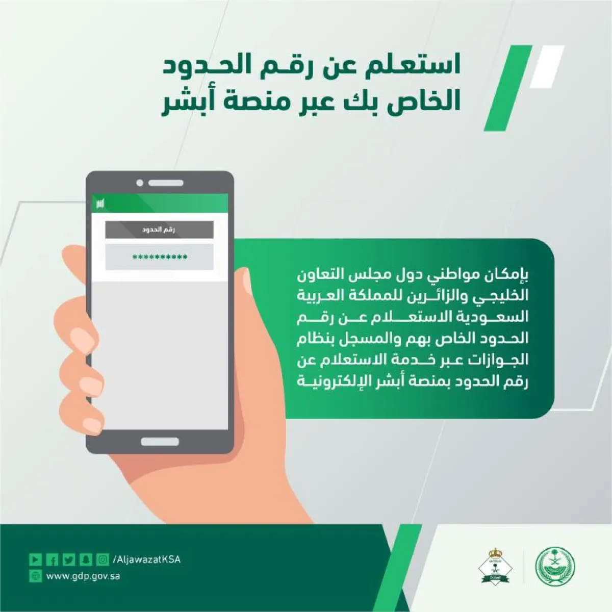 وقالت المديرية العامة للجوازات، في تغريدة على موقع "تويتر"، عبر منصة "أبشر" الإلكترونية، بإمكان مواطني دول مجلس التعاون الخليجي والزائرين للمملكة العربية السعودية الاستعلام عن رقم الحدود دون الحاجة لمراجعة إدارات الجوازات.