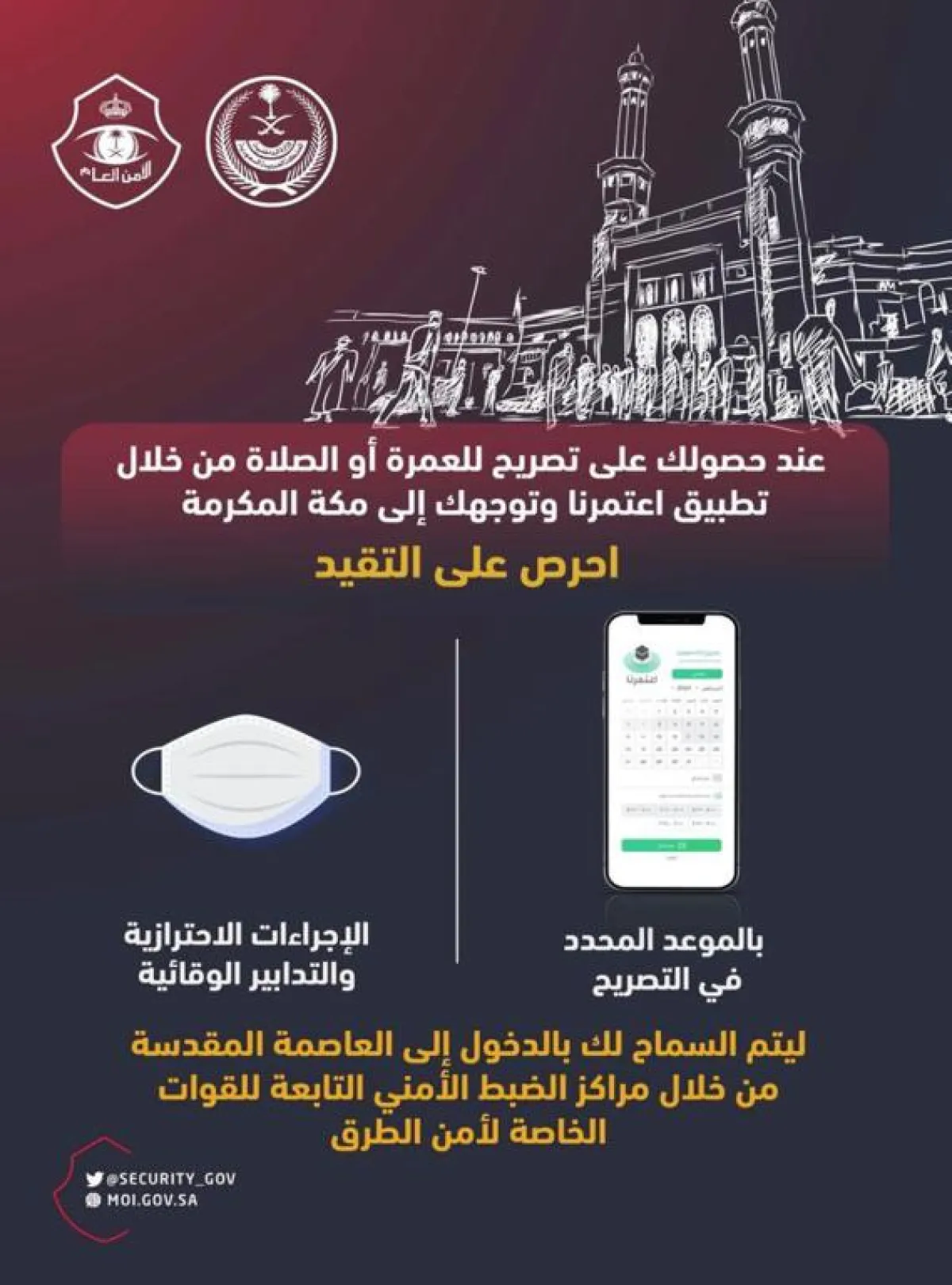 نشر الأمن العام عبر حسابه الرسمي على موقع التدوينات المصغر "تويتر"، انفوغراف، دعا من خلاله عموم المواطنين والمقيمين الذين حصلوا على "تصريح العمرة أو الصلاة في المسجد الحرام" من خلال تطبيق "اعتمرنا" إلى التقيد بالموعد المحدد.
