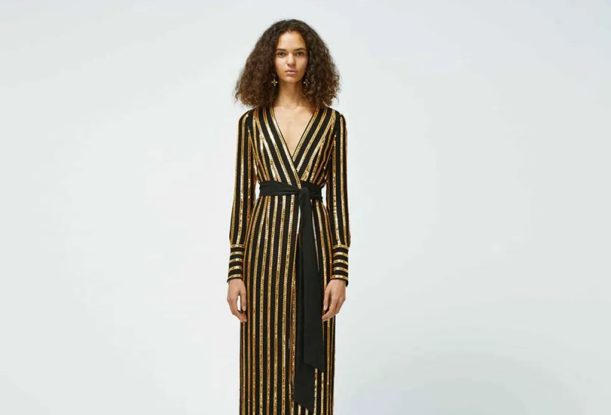 لتصميم أكثر فخامة وأناقة يناسب الخروجات والسهرات المسائية، يُمكنكِ الاستعانة بهذا الفستان المقلم من ماركة Galvan، وهو فستان أسود بتصميم مقلم، صُممت خطوطه من الترتر الذهبي المطرز، مع توب ذي أكمام طويلة ذي فتحة صدر على شكل حرف V، وحزام عريض على الخصر، وتنورة طويلة بتصميم A line.