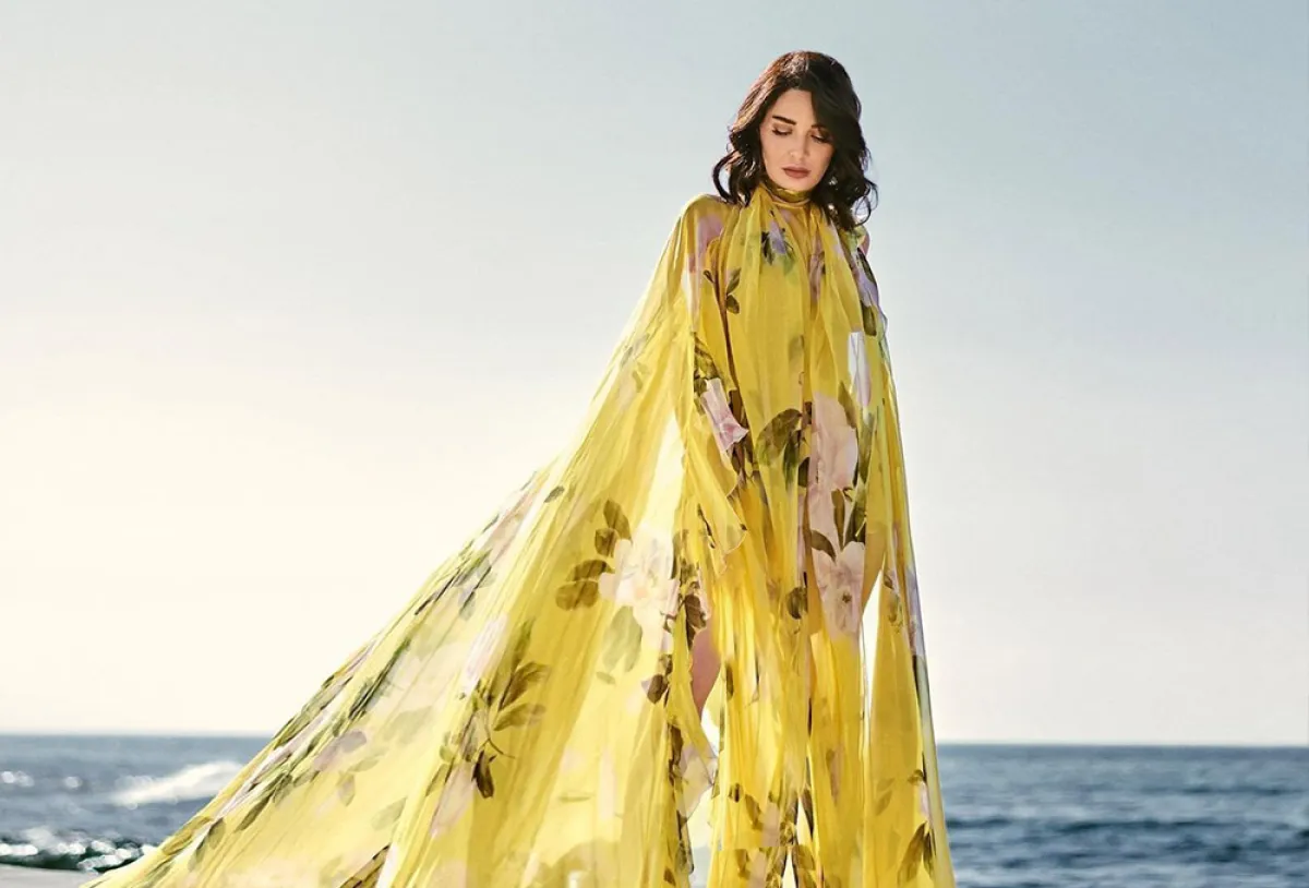 تألقت النجمة سيرين عبد النور بفستان من الحرير الأصفر المطبع بالزهور من تصميم فالنتينو وهو ينتمي إلى أول مجموعة أطلقتها الدار من ميلانو في أكتوبر الماضي. لقد أراد المصمم المبدع بيار باولو بيكولي تصميم مجموعة تجسد الحرية والرومنسية فكان له ما أراد، وقد اختارت سيرين هذا الفستان حيث تمت جلسة التصوير في منتجع kalani resort ونسّقت معه حقيبة بيج مزدانة بالمسامير التي ارتبطت بهوية الدار الإيطالية، فيما اختار المصمم تنسيق حقيبة ممائلة ولكن باللون الزهري الباستيل.
