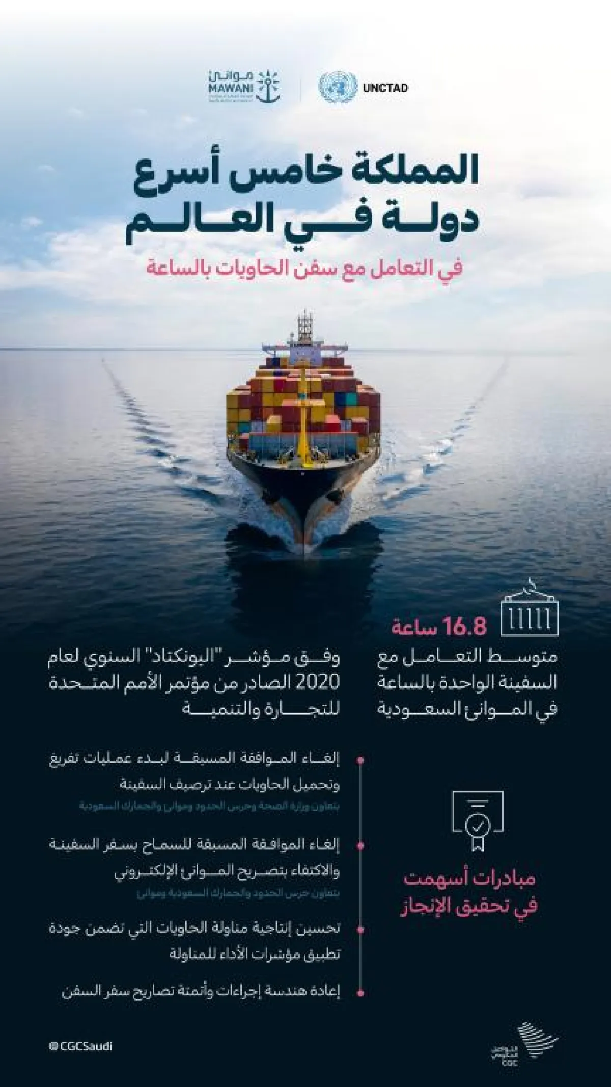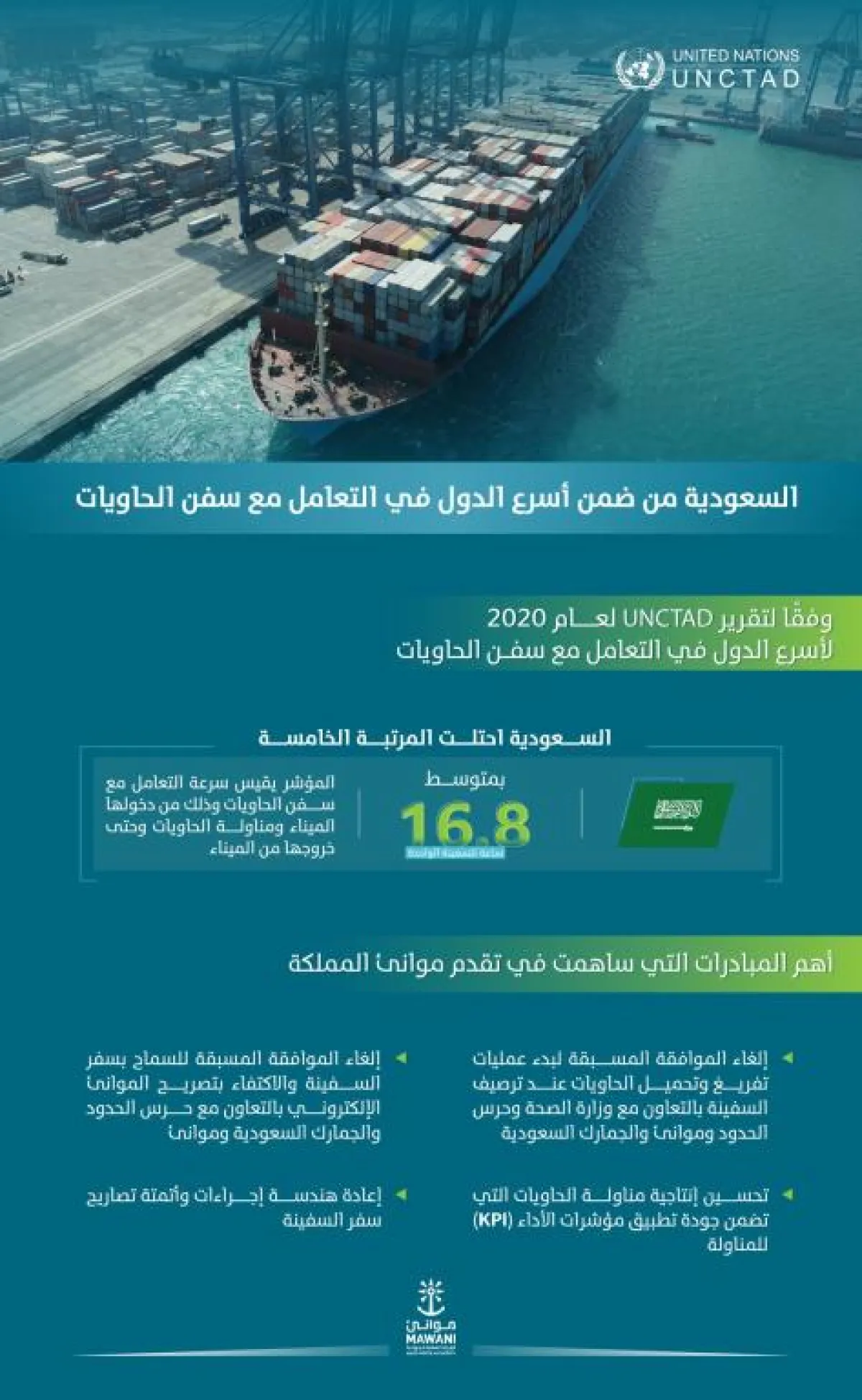 في إنجاز جديد يضاف لإنجازات المملكة العربية السعودية تبوأت موانيء المملكة المرتبة الخامسة كأسرع دول العالم في مناولة سفن الحاويات، وذلك وفق مؤشر "اليونكتاد" السنوي لعام 2020 الصادر من مؤتمر الأمم المتحدة للتجارة والتنمية.