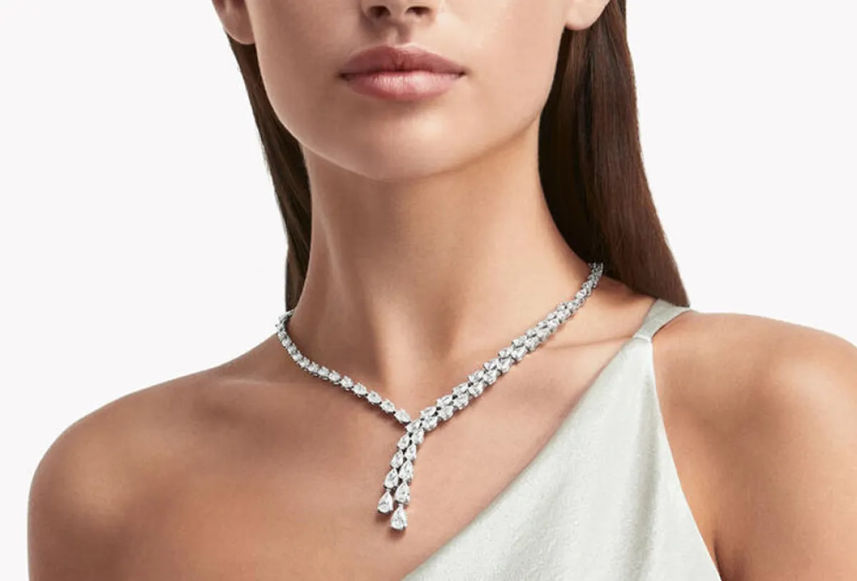 لإطلالة جذابة ومميزة للعروس التي ترغب في الظهور بإطلالة الأميرات في ليلة زفافها، قدمت ماركة Harry Winston طقم ألماس مميزاً، مكوناً من قلادة فخمة ذات سلسلتين مرصعتين بالألماس، مع وردة كبيرة الحجم تتدلى من المنتصف، إضافة إلى خاتم وأقراط على شكل أوراق الشجر كبيرة الحجم والتي تتوسطها كمثرى، مُصممة من الذهب الأبيض المُرصع بالألماس.