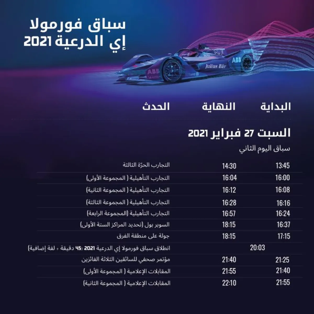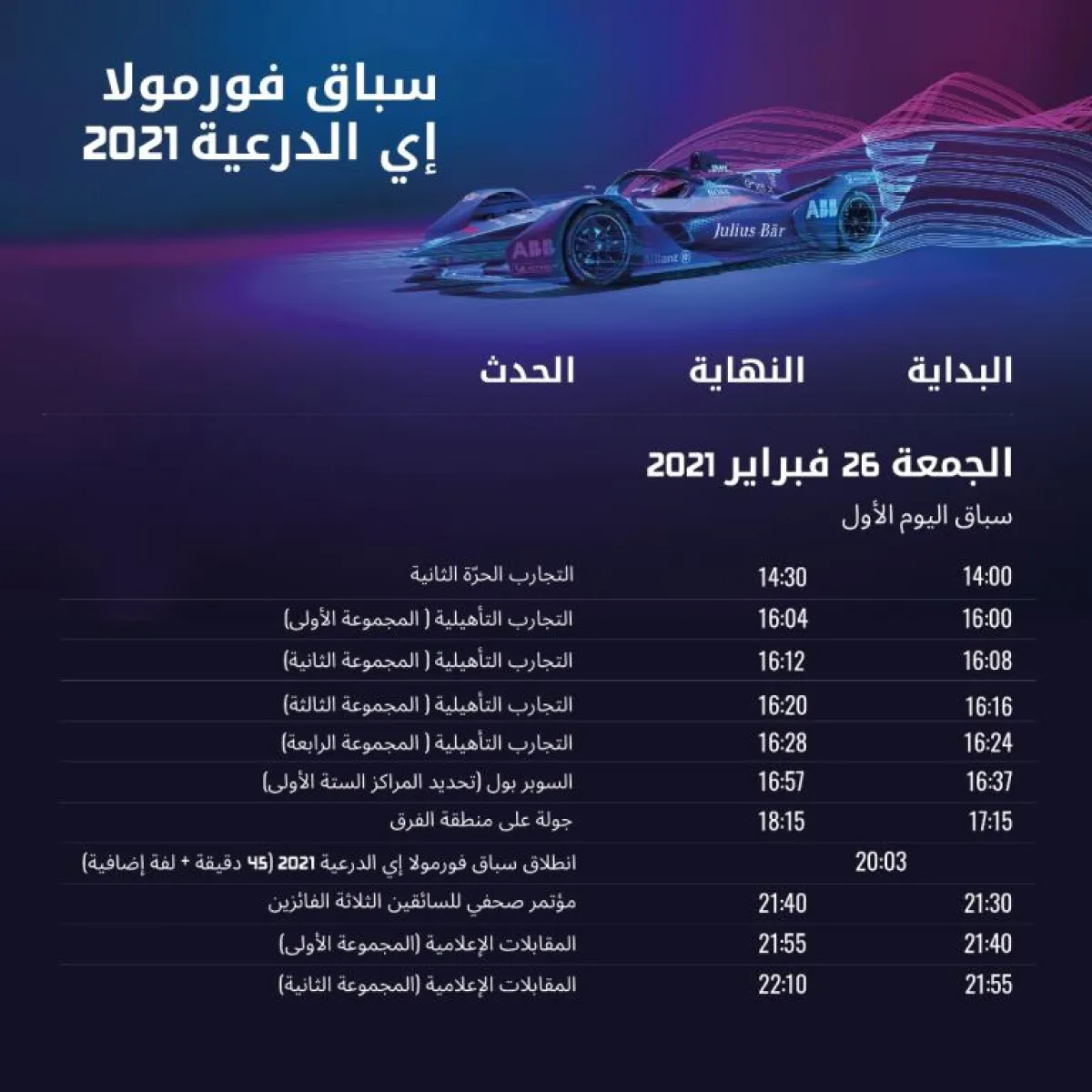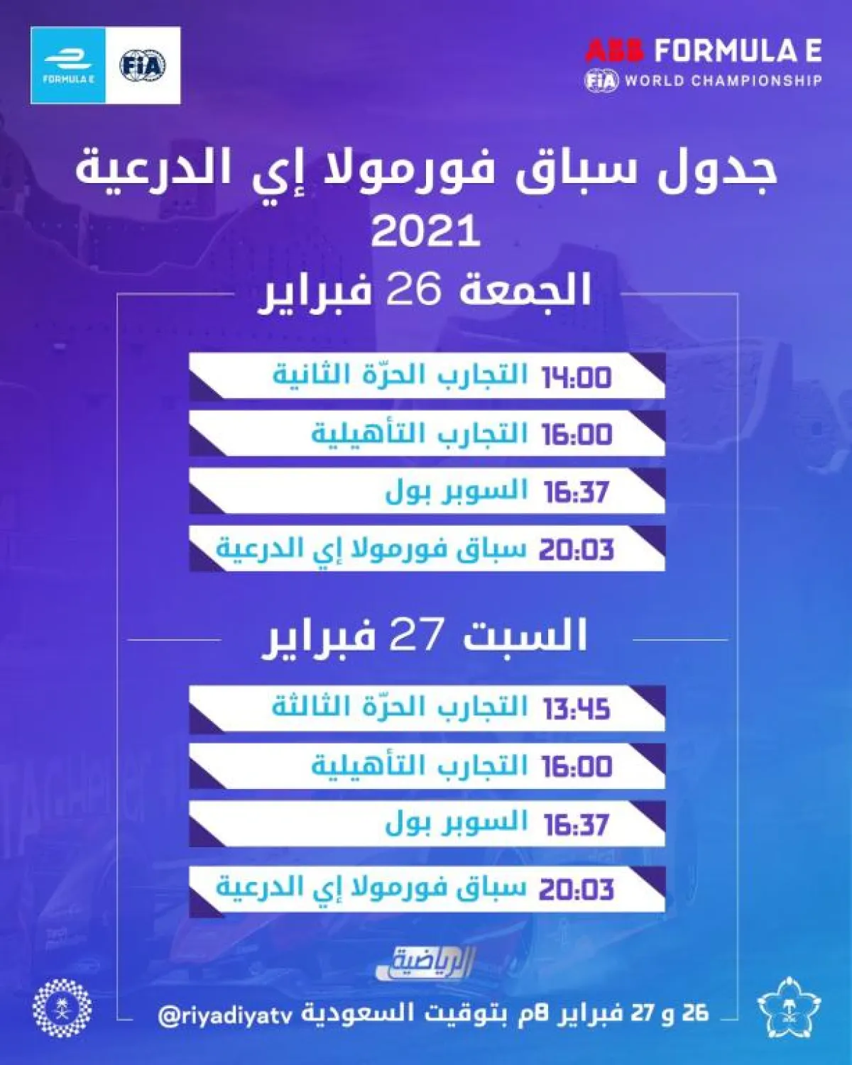 أعلن الحساب الرسمي للاتحاد السعودي للسيارات والدراجات النارية الجدول الكامل للجولتين الأولى والثانية من الموسم السابع من بطولة العالم المثيرة الفورمولا إي 2021 التي تستضيفها السعودية في الدرعية للموسم الثالث على التوالي مؤكدا أنها ستنقل مباشرة على قناة الرياضة ليطلع جميع من لم يستطع الحضور على السابقات أولا بأول ويواكب الحدث التاريخي بتطبيقه الإجراءات الاحترازية، ويميز هذا العام إقامة البطولة لأول مرة ليلا بتقنية إضاءة LED صديقة البيئة وذلك بتنظيم وزارة الرياضة وبالتعاون مع الاتحاد السعودي للسيارات والدراجات النارية