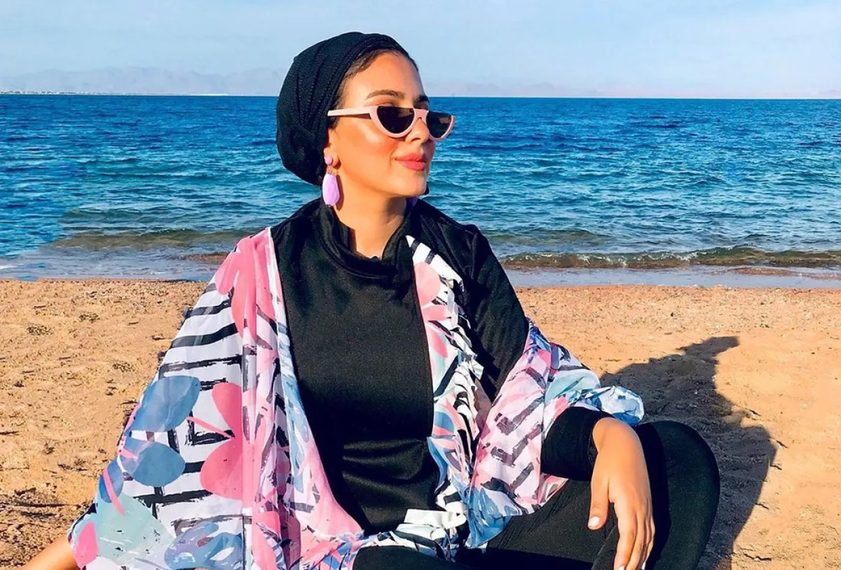 تجملت الموديل المصرية، غفران، بإطلالة أنثوية ومحتشمة للبحر، بارتدائها بلوزة سوداء مزينة بقماش بنفسجي منقوش بالفضي في أطراف الأكمام وفي الخصر مع بنطال أسود بتصميم ناعم وأنيق، وأكملت مظهرها بحجاب أسود واكسسوارات ملونة لخيار ناعم وأنيق.