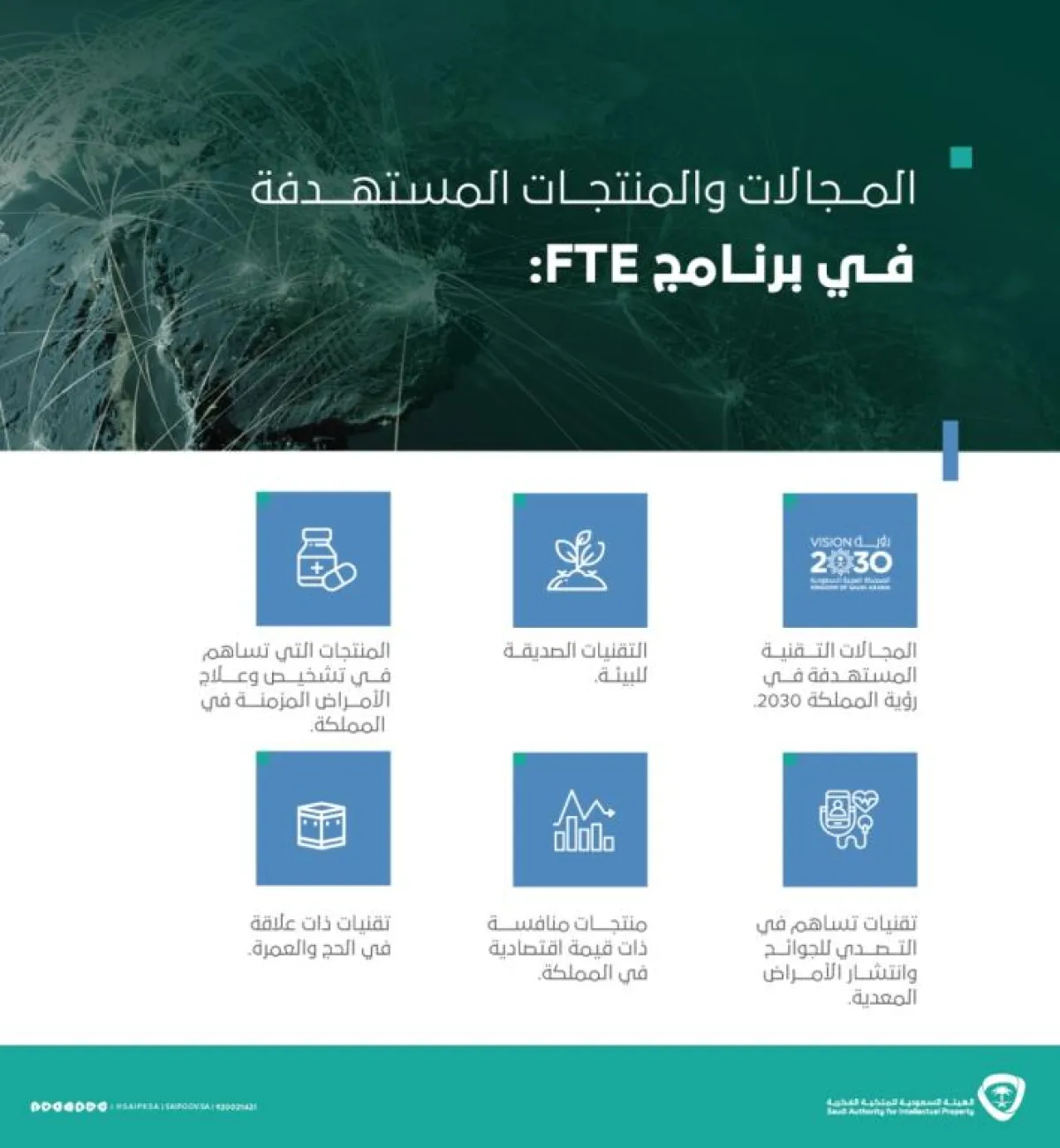 وأوضحت الهيئة المجالات المستهدفة وهي (المجالات التقنية المستهدفة في رؤية المملكة 2030 ومن أهمها التقنيات الصديقة للبيئة والمنتجات التي تساهم في تشخيص وعلاج الأمراض المزمنة وتقنيات تساهم في التصدي للجوائح وانتشار الأمراض المعدية ومنتجات منافسة ذات قيمة اقتصادية في المملكة بالإضافة لتقنيات ذات علاقة بالحج والعمرة).