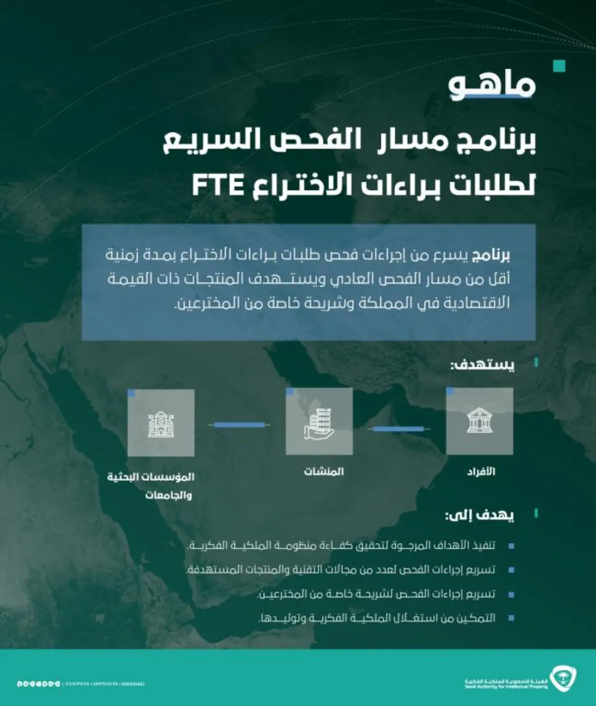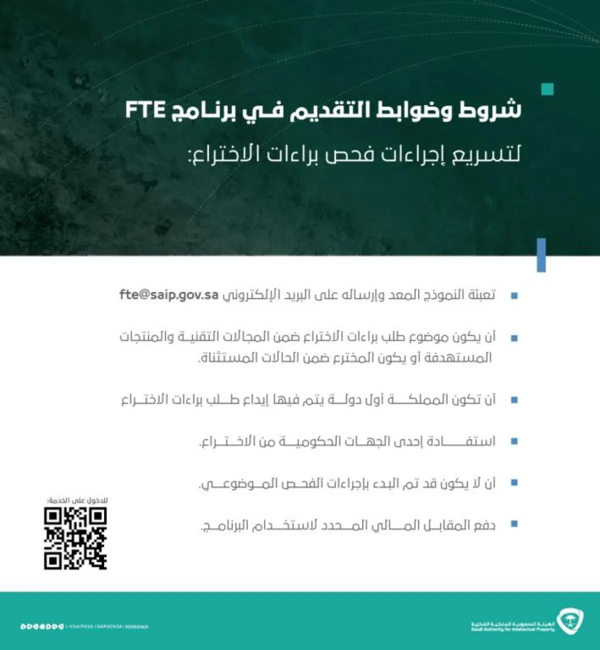 أعلنت الهيئة السعودية للملكية الفكرية عن إطلاق برنامج المسار السريع لفحص طلبات براءات الاختراع FTE ، والذي تهدف من خلاله إلى تسريع الفحص لعدد من مجالات التقنية والمنتجات المستهدفة من خلال مسار فحص أسرع من مسار الفحص العادي وفق ضوابط وشروط محددة المنشورة بموقع الهيئة.