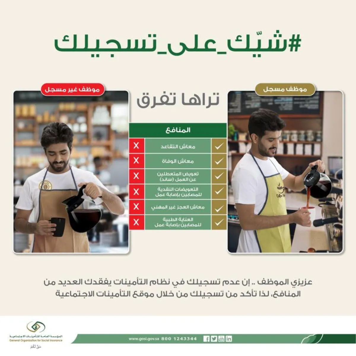 كما أوضحت التأمينات إن عدم تسجيل الموظف في نظام التأمينات يفقد العديد من المنافع، كما أكدت على ضرورة التسجيل من خلال موقع التأمينات الاجتماعية.