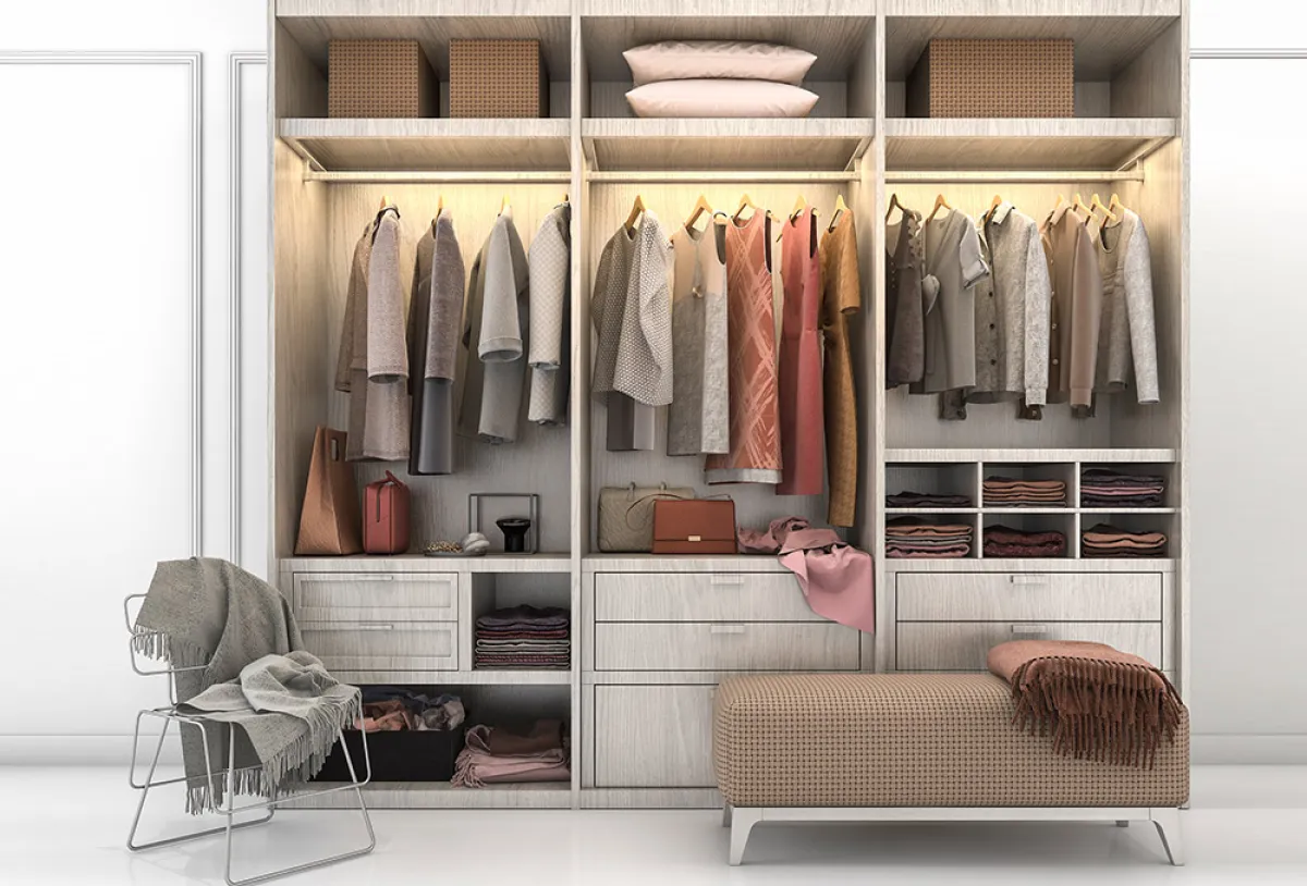 • يمكن تصميم الخزائن من دون أبواب، أمّا عند إغلاقها بالأبواب، فتكسى الأخيرة بالمرايا.